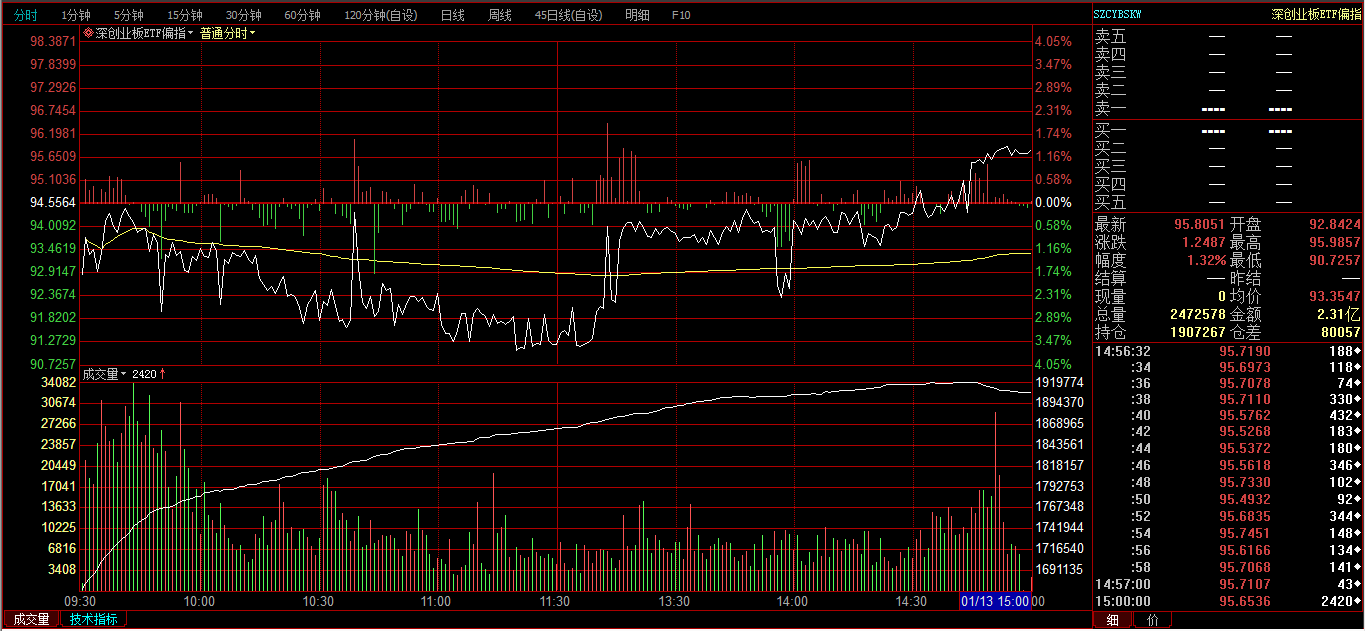 创业板ETF走出V形反转形态,涨0.043,收于3.335;创业板ETF波指涨0.10,收于24.37;创业板ETF偏指收涨。