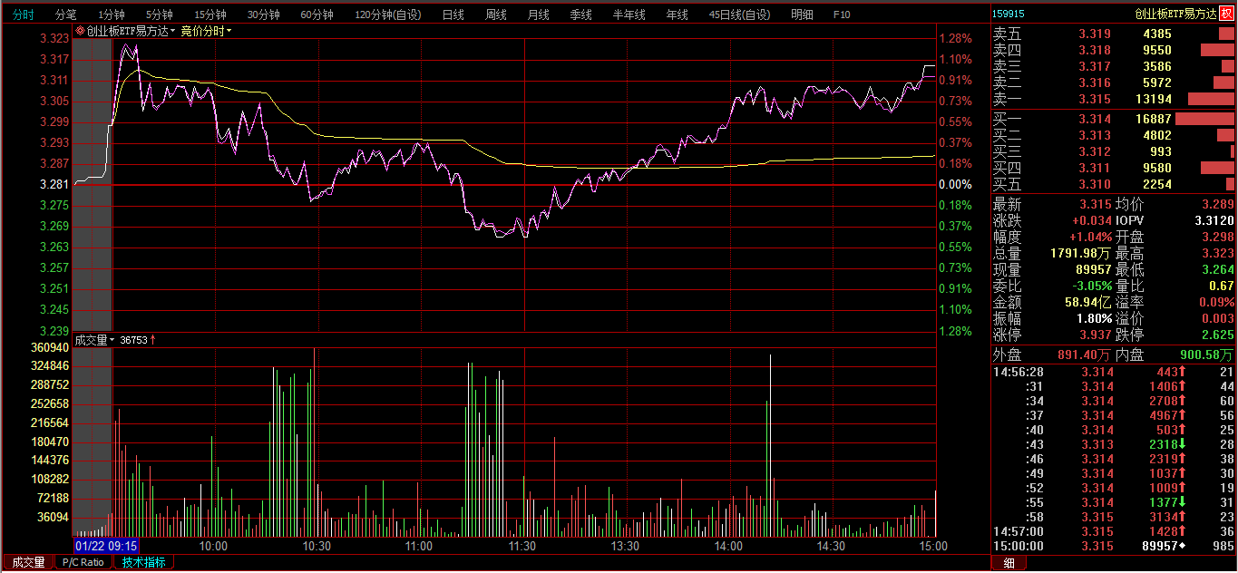 创业板ETF涨0.034,收于3.315;创业板ETF波指涨0.60,收于22.60;创业板ETF偏指收涨于100之上。