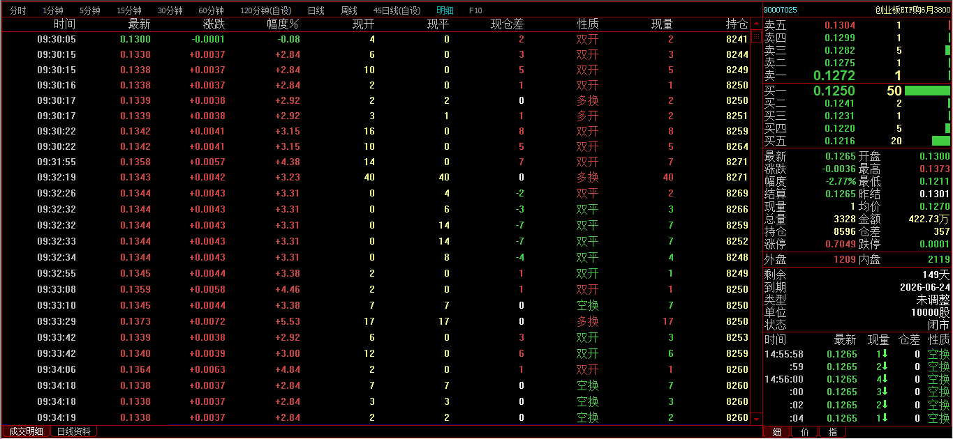 创业板ETF购3月3700卖开2张,成交价0.0321、0.0348。该合约15:00:00以0.0322成交100张,空开,14:56:17以0.0328成交3张,多换,收涨,但昨日却收跌,而标的连涨两日。搞不明白,也不想明白,总是要开仓的。