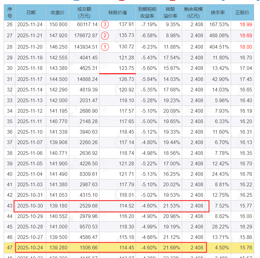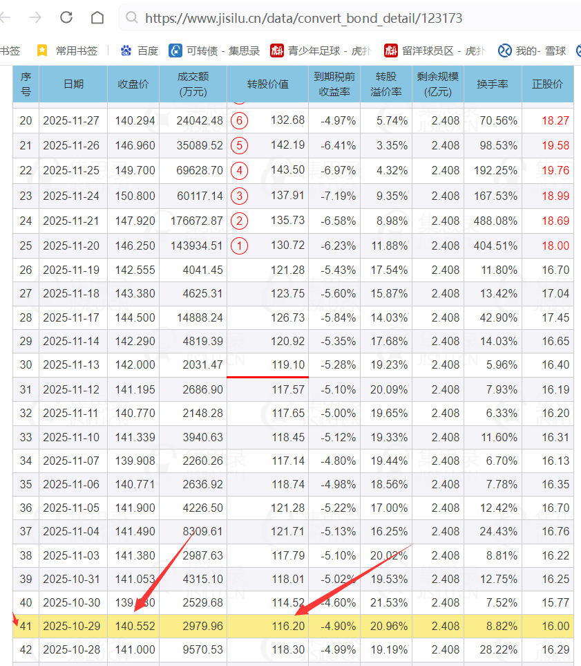 结合当前转股价值116对比和10月的转股价值也是116时的可转债当时价格是140.552元。