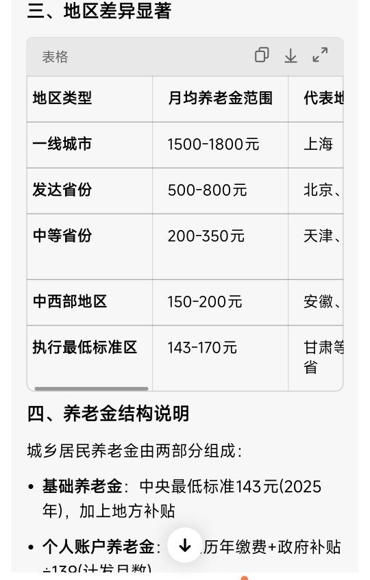 截至2025年初,-城乡居民养老保险:领取待遇人数18039万人(1.8亿),. 城乡居民养老金≠退休金:许多农村老人虽参加城乡居民养老保险,但月均仅165元,远低于"退休金"水平,中国无退休金老人的规模庞大,约1.6-1.9亿,主要集中在农...
