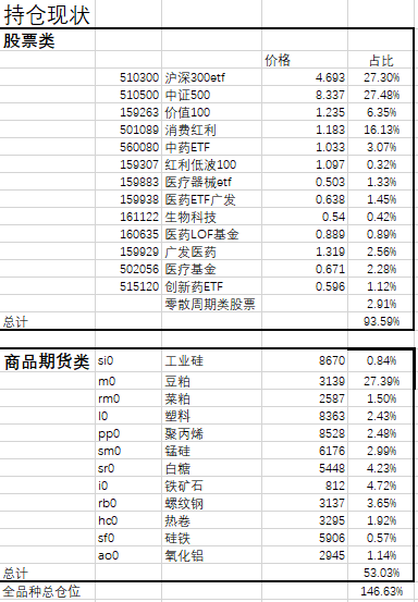 商品期货方面主要加仓锰硅,白糖实值期权,塑料,pp有所反弹,豆粕表现一般,从历史轮动规律看农产品估计最后才能表现,不过这东西有贴水,一直拿着也无所谓,占用不了多少资金,涨跌随意。