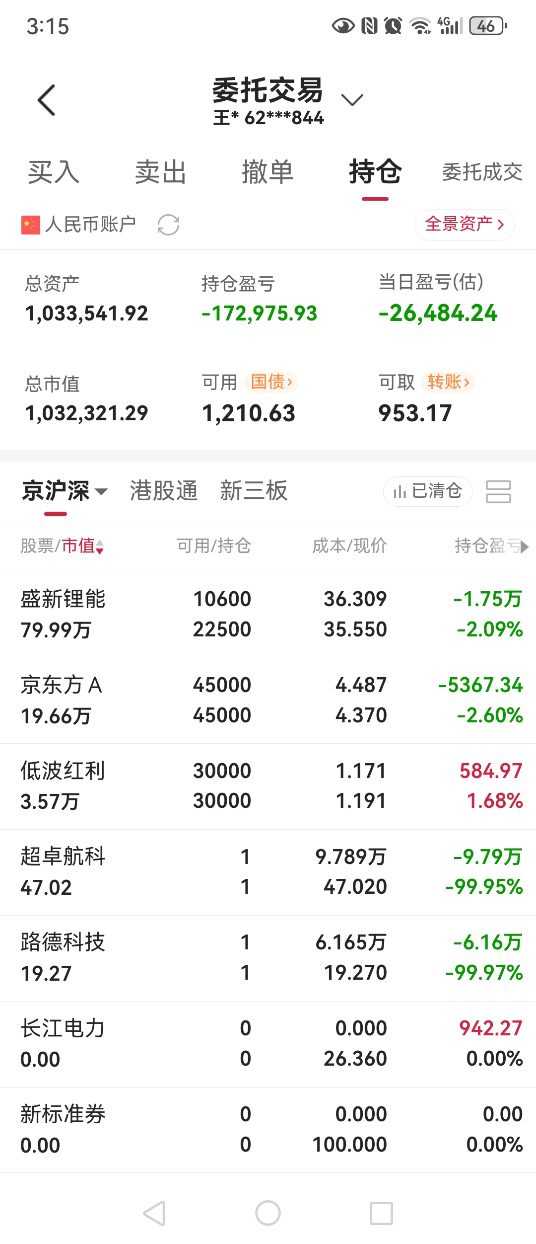 今日两个重仓股盛新能源和京东方都大跌,盛新低位的没有全部T出去,仓位增加,成本降低。