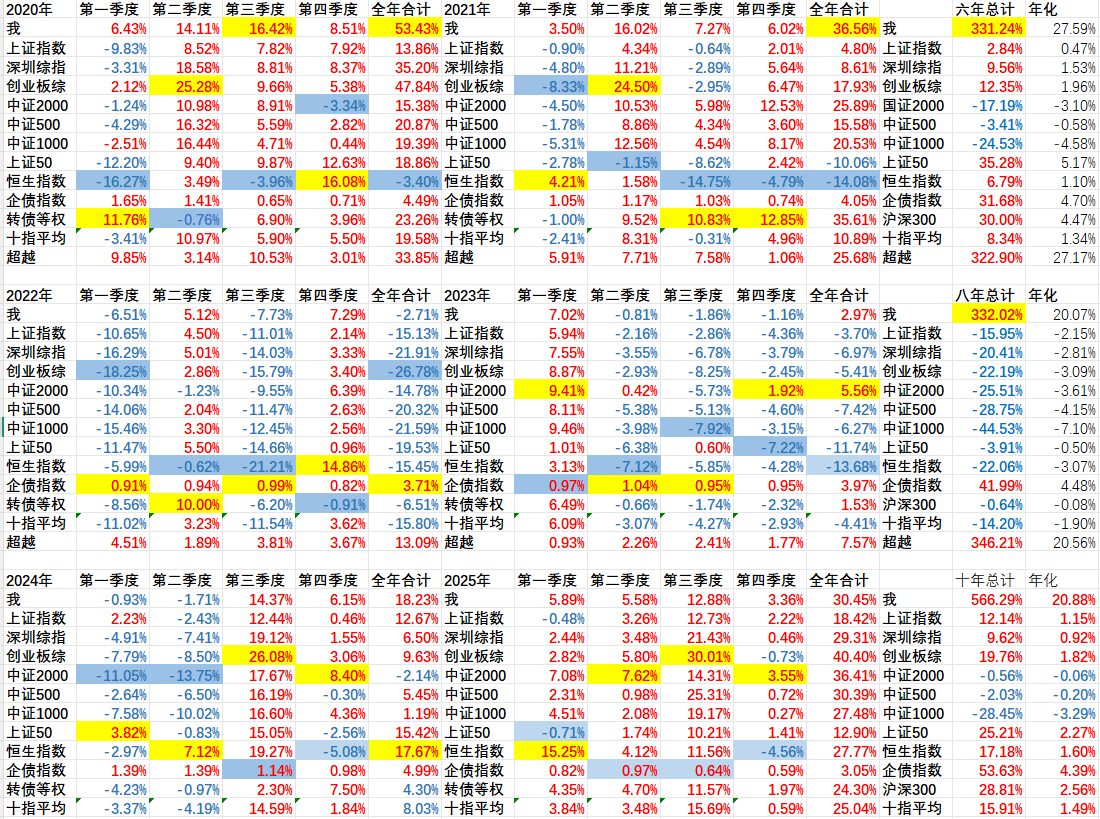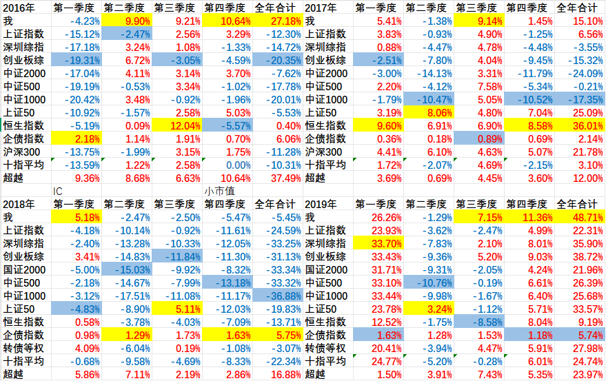跑赢的主要原因是前六年分仓打新,网下转债这些生意带来的收益较高,股票低频量化和转债轮动都比较容易跑赢。 近四年基本只能跟随大盘了。 而且资金量大了之后自己也越发谨慎,今年下半年整体仓位只有65%。