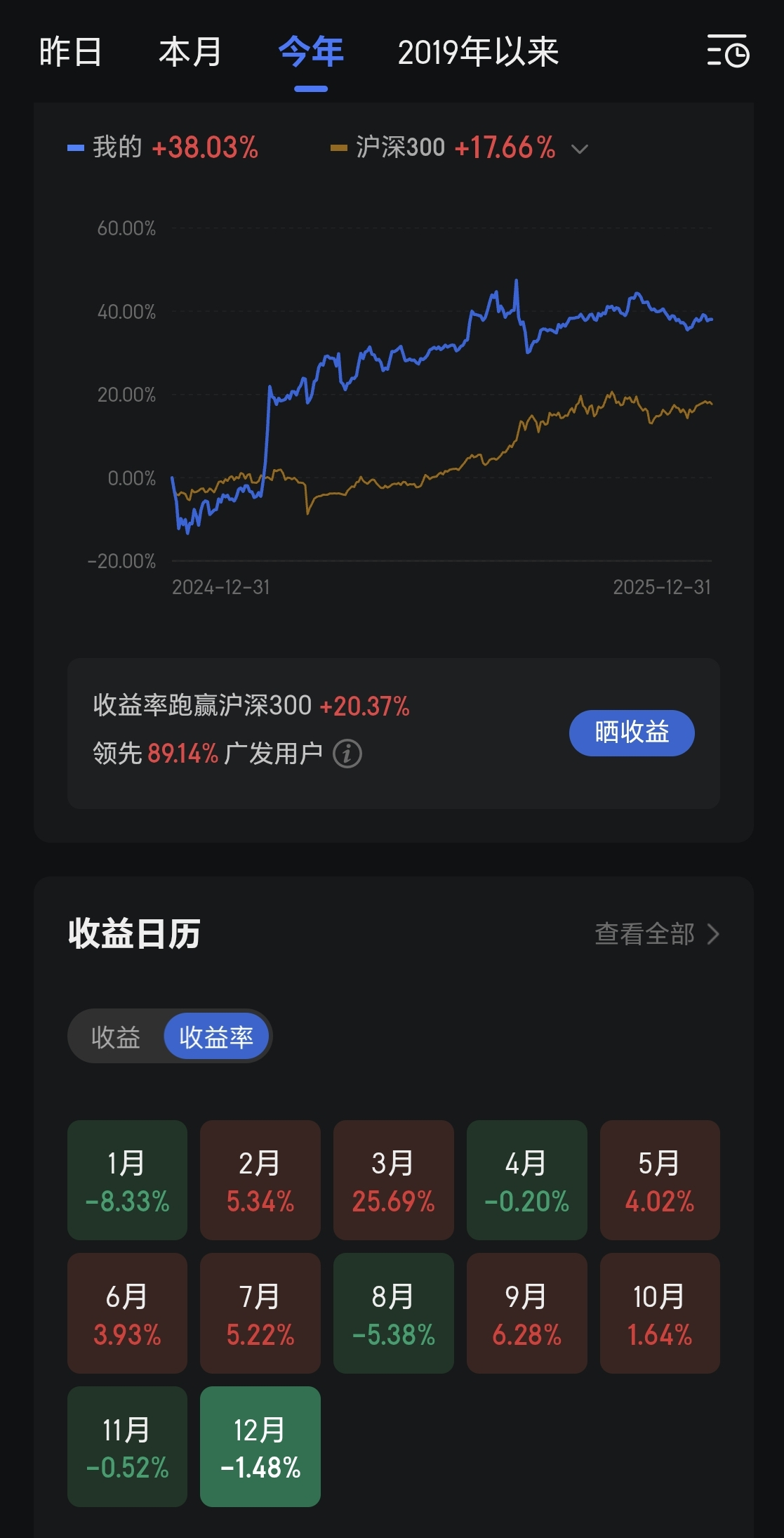 兜兜转转一年,2025年全年38.03%,年底买了部分白酒和消费,导致收益跑输大盘。