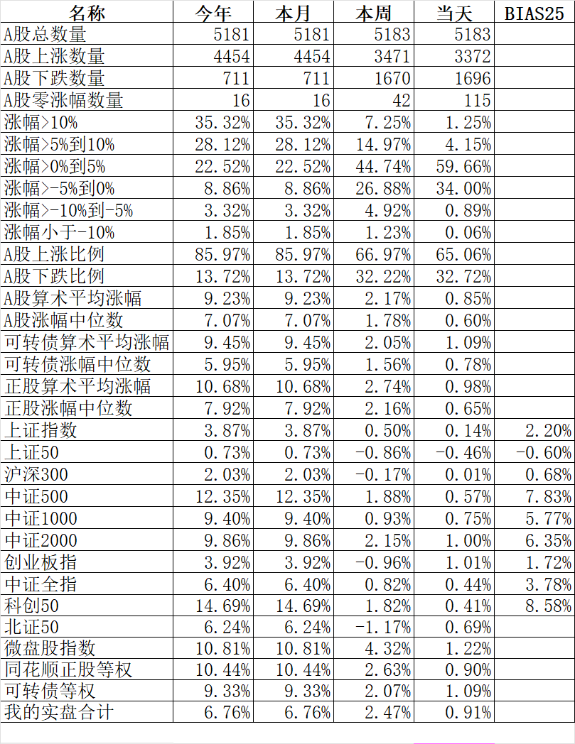382只可转债平均涨0.70%,对应正股平均涨1.07%。我的主仓20只可转债平均涨0.23%,对应正股平均涨0.81%。