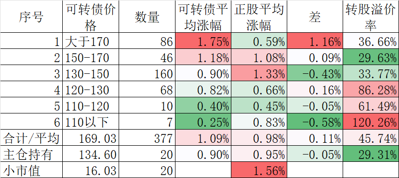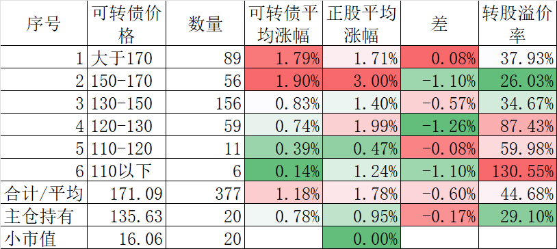 380只可转债平均上涨0.35%,对应正股平均上涨0.36%。我的主仓20只可转债平均上涨0.12%,对应正股平均上涨0.63%。