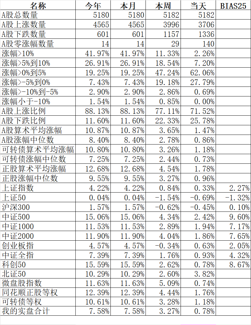382只可转债平均上涨1.71%,对应正股平均上涨1.75%。我的主仓20只可转债平均上涨0.96%,对应正股平均上涨1.65%。