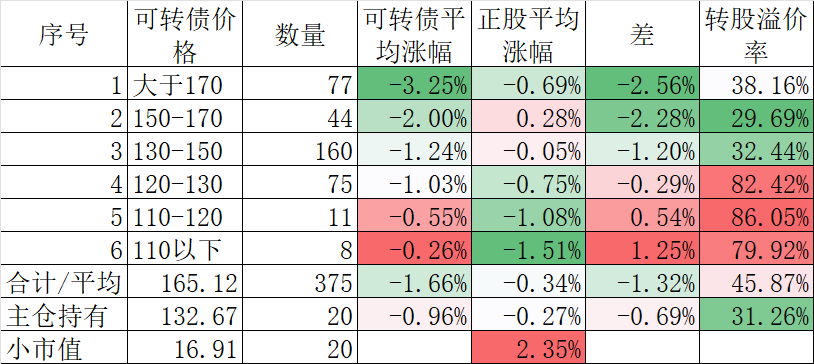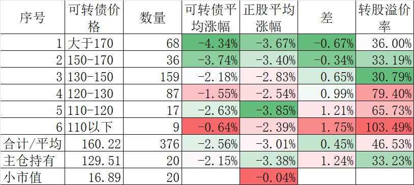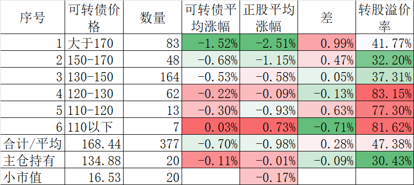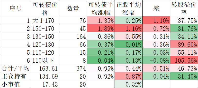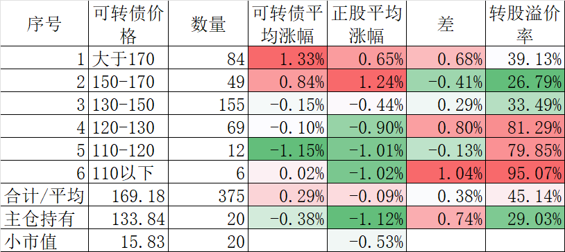 381只可转债平均跌1.29%,对应正股平均跌1.13%。我的主仓20只可转债平均下跌1.14%,对应正股平均只下跌了0.13%。我的20只可转债杀溢价远远超过全市场。