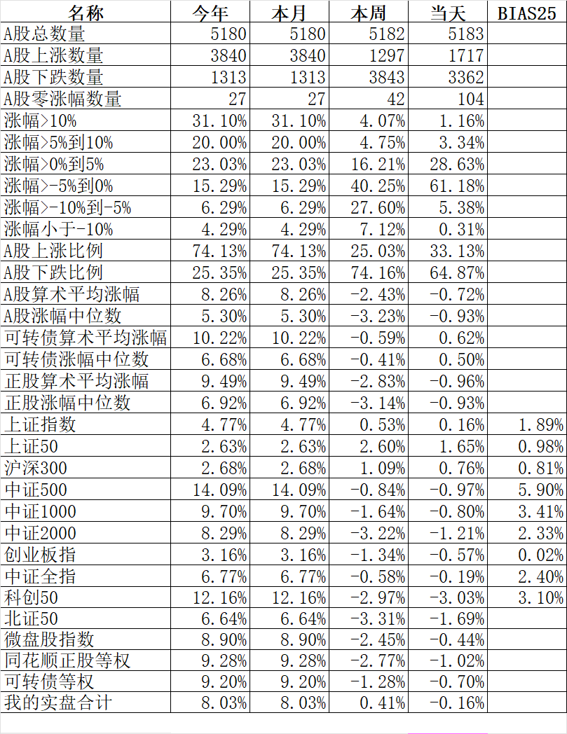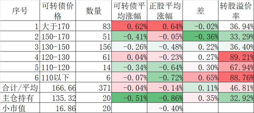 371只可转债平均下跌0.04%,对应正股平均下跌0.14%。我的主仓20只可转债平均下跌0.51%,对应正股平均下跌0.86%。