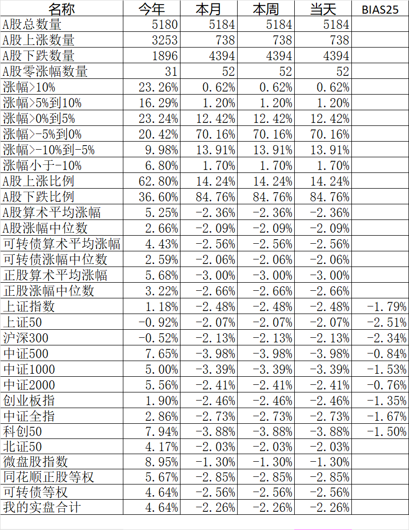 今天主仓卖出排名靠后的康泰转2,买入排名靠前的晶能转债。最终略有超额,账户合计下跌0.46%,还是大幅度跑输了可转债等权指数,导致今年又从跑赢变成跑输了。