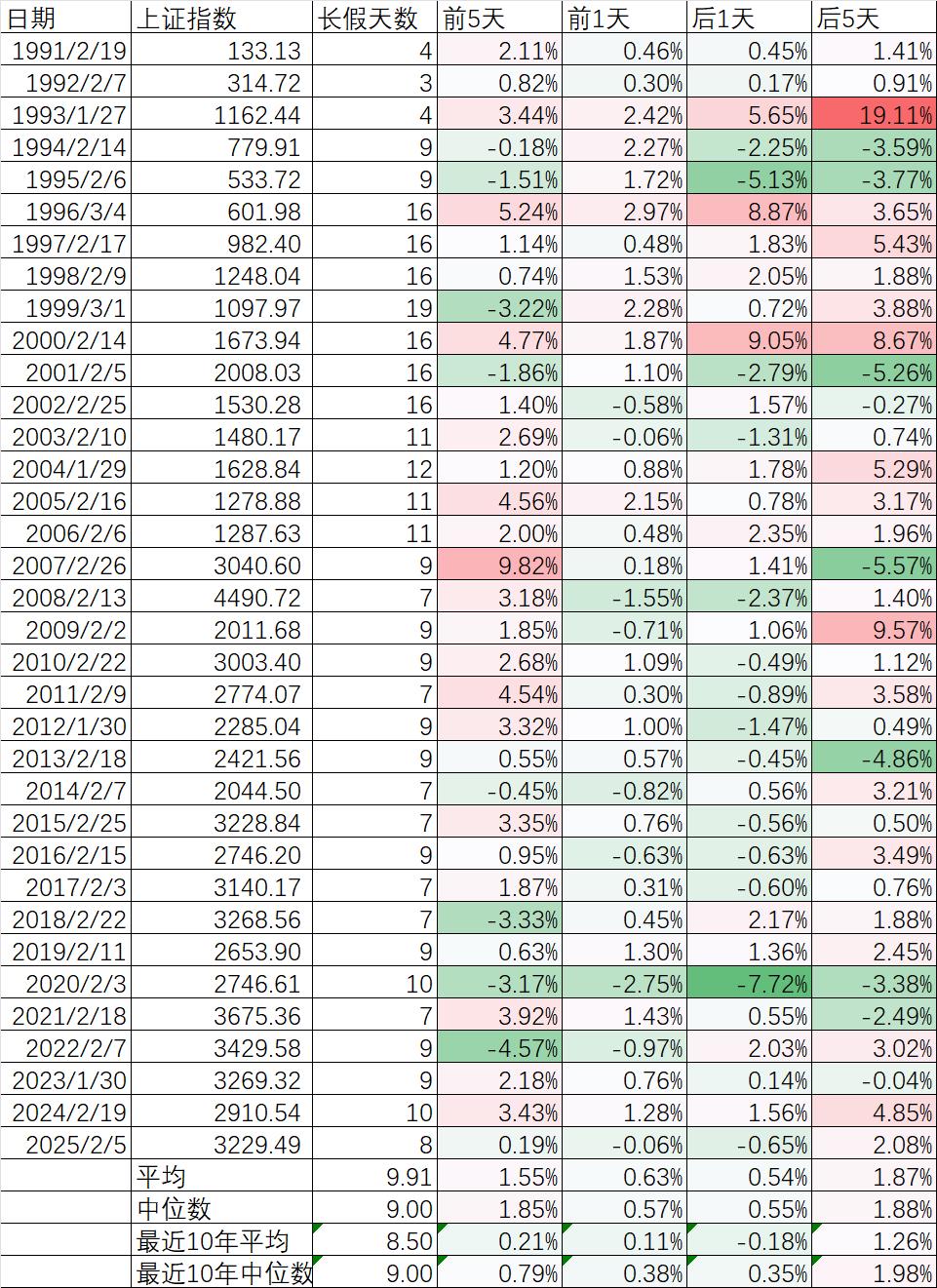 春节长假这次放的特别长,足足有10天不交易,我盘点了一下,历史上1999年最长有连续19天不交易。我们来看一下从1991年开始的足足35年上证指数在春节长假前后的表现。