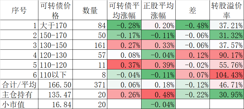 371只可转债平均上涨0.06%,对应正股平均上涨0.18%。我的主仓20只可转债平均上涨0.26%,对应正股平均上涨0.48%。