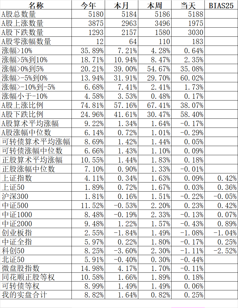 1975只个股上涨,3030只个股下跌,涨幅中位数-0.29%。