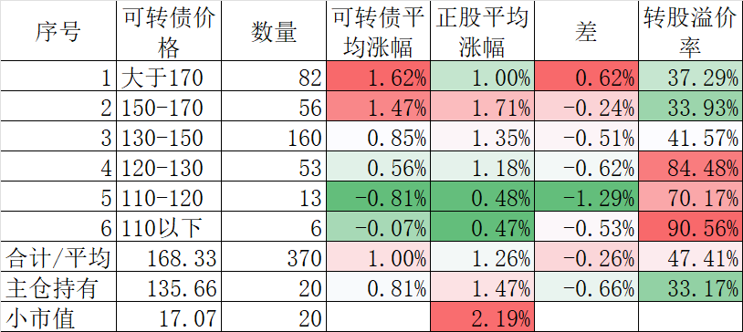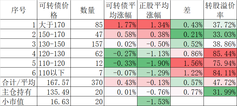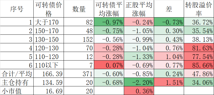 370只可转债平均下跌0.40%,对应正股平均下跌1.83%。我的主仓20只可转债平均下跌0.08%,对应正股平均下跌1.26%。