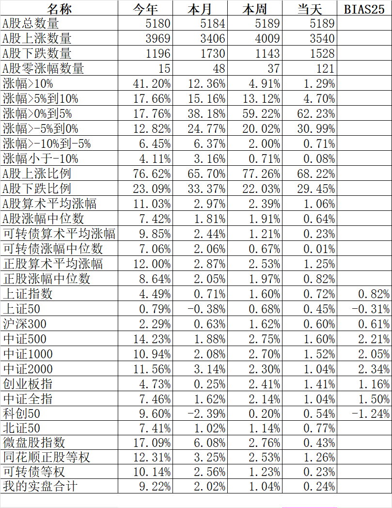 不仅全市场冷热不均,而且可转债也是冷热不均,这里的热主要在高价债,低价债冷其实也不算冷,只不过和高价债相比就显得冷了,今年转债等权指数涨了10.61%,但其实中位数也只涨了7.21%,差了3%多,我自己可转债账户合计今年涨了7.58%,虽然严重跑输转债等权指数,但基本上和中位数差不多,也不是特别落后,也算是自我安慰。