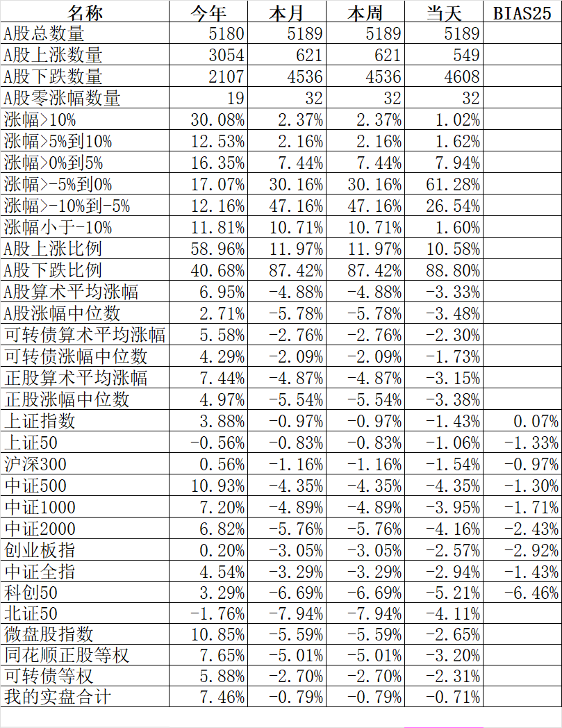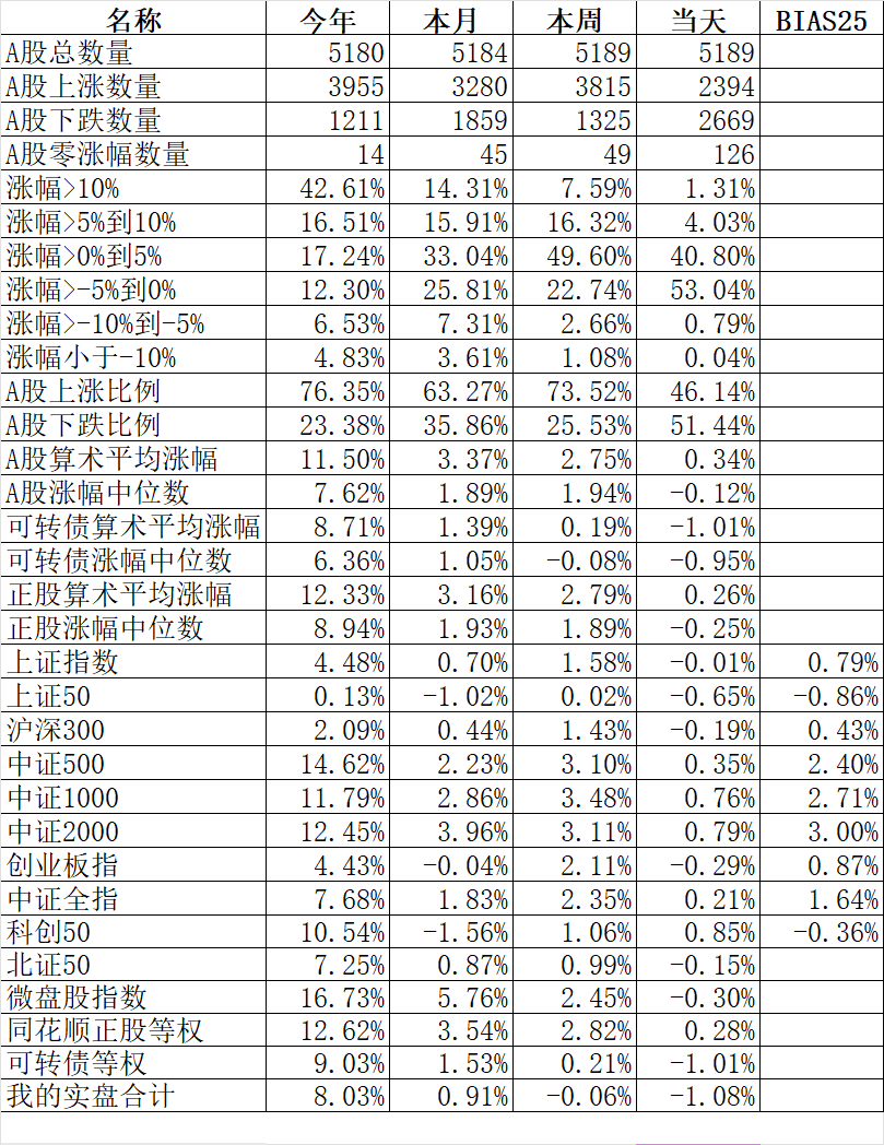 主流宽基指数全部下跌,跌幅最小的上证50跌1.06%、上证指数跌1.43%;跌幅最大的科创50跌5.21%、中证2000跌4.16%。今天这样一跌,今年北证50、上证50都到了水下去了。