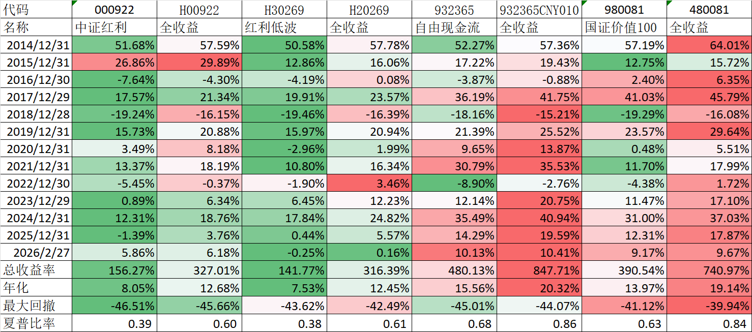 今天除了三桶油二连板外,红利表现也不错,我收集了中证红利、红利低波、自由现金流、国证价值100等表现长期表现较好指数,数据截止到2月27日,最大回撤和夏普比例是我自己根据原始数据计算的,其中无风险利率取了2%,一年取了250个交易日,同时列出了对应的全收益指数的收益率: