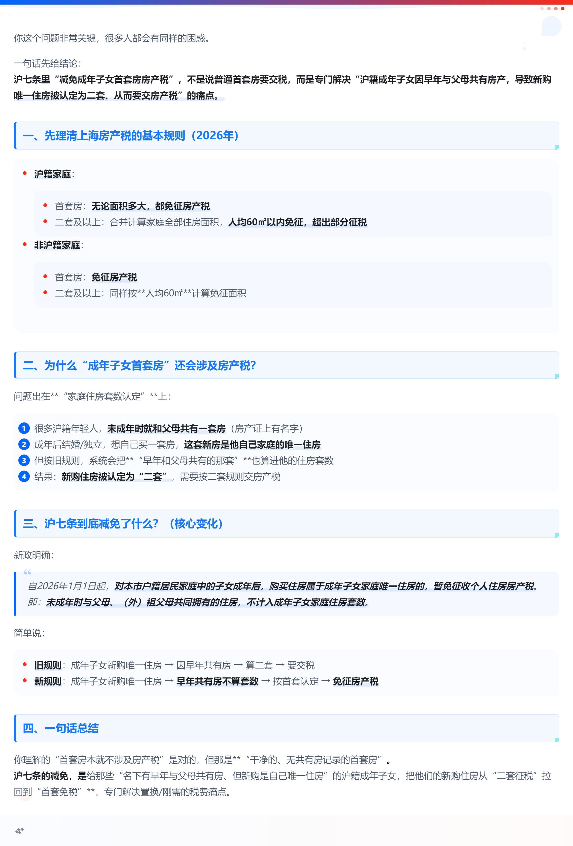 2026.2.25 上海发布楼市新政“沪七条”:核心是大幅松绑非沪籍限购、大幅提高公积金贷款额度、减免成年子女首套房产税,直接利好刚需与改善,尤其利好非沪籍、多子女家庭与置换人群。