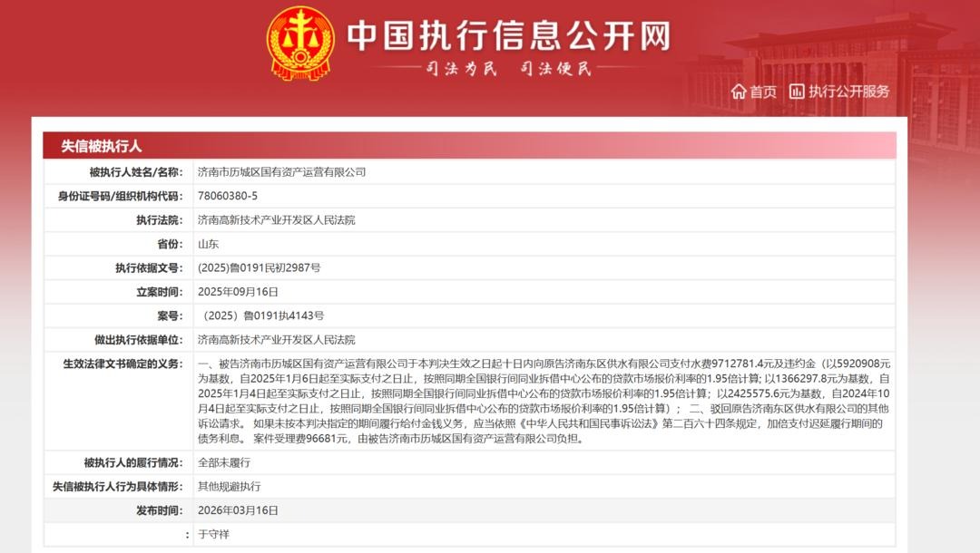 济南市历城区国有资产运营有限公司 沦为失信被执行人