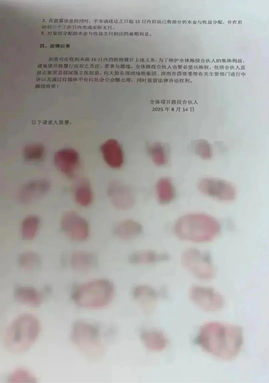 2025年9月,长沙万科森林公园项目27名跟投员工联名签署带红手印公开信,提交给万科董事长辛杰与中央巡视组。