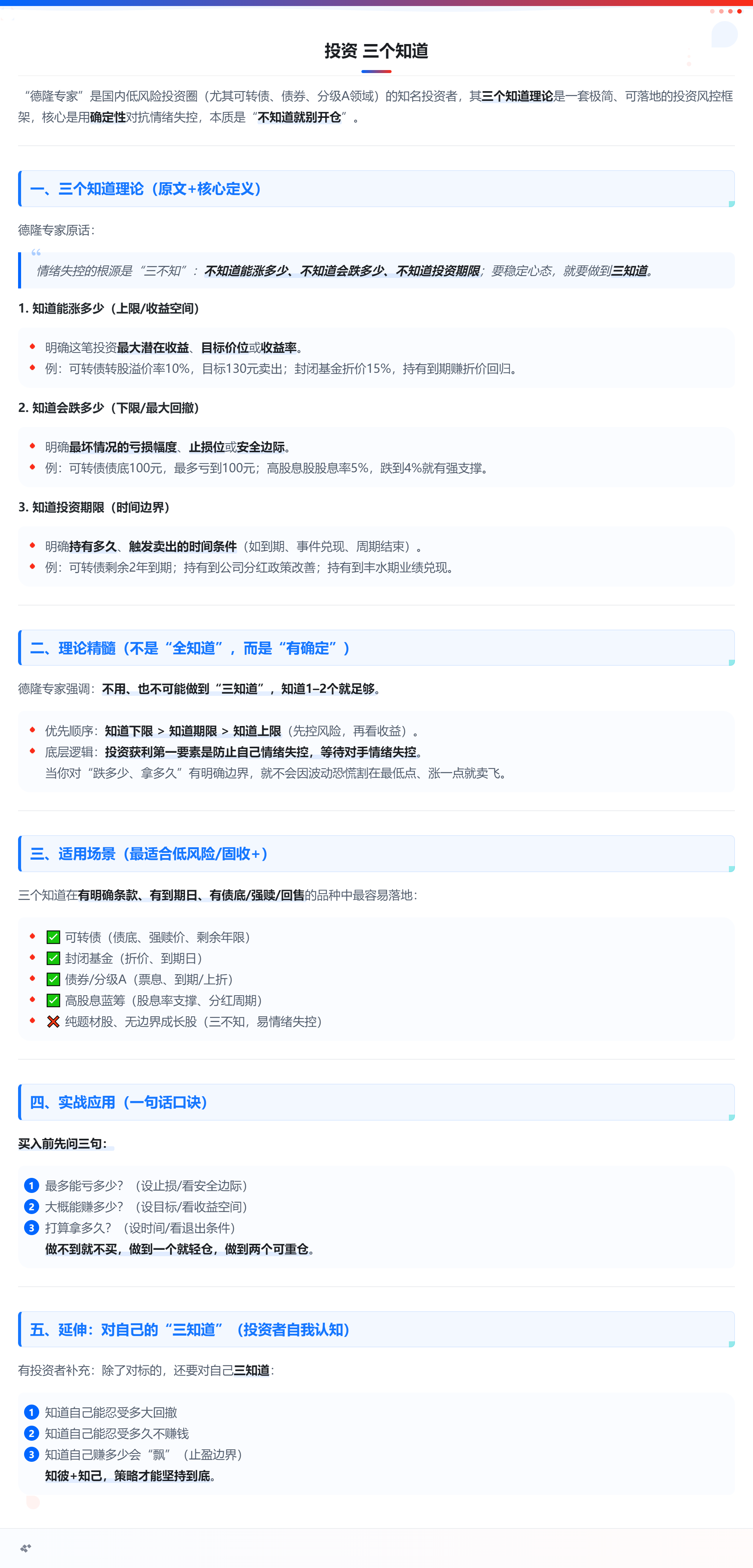 这是我媳妇自己做的小账户,资金不多,就10个这样,之前一直说账户都是我在操作,自己没实战经验,光听我说教学不到东西,去年入金后我说这个账户随你操作,你爱咋搞咋搞,我不干预。今年我赚10%,她-2%,里外里12个点,她说不知道问题出在了哪里。我说持仓都是公开的,开卷让你抄你都能抄这样,你不知道问题出在了哪里了么? 然后我搬出了德隆专家老师的“三个知道”,你知道问题出在哪里了么?就是你做投资是什么也不知道。不知道为什么买,不知道为什么卖,别人进了你也进,别人说位置高了要跑你也跑,打仗没有章法,乱搞一通,赚钱了就是本事,亏钱了就是运气不好。就拿可转债这个品种来说,在搜特、广汇之流没出问题之前,可转债是一个非常好的品种,就是现在也是,只是目前水位高了而已。在发行可转债的公司不违约不当老赖的前提下,可转债就是下有底,上有顶,知道持有时间的好品种。怕踩雷可以通过分散的方式就可以了,限制单个标的的仓位。