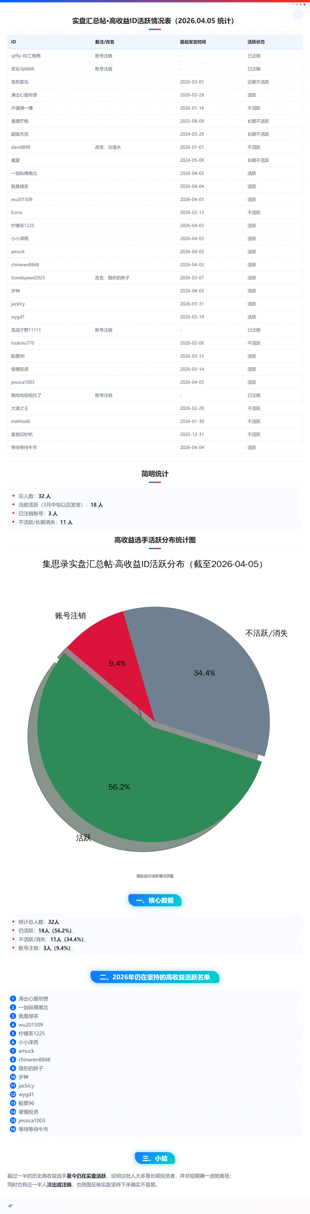 刚才去把《实盘汇总贴》这几年收益特别高的ID一个一个去搜索了一下,那种收益特高(名单中一骑绝尘那种)存活率低,基本都是短命鬼。所以说名单中收益特高、特低的这些可以排除,当做异常值和噪音,应该关注那些自己可学习可复刻的老师。