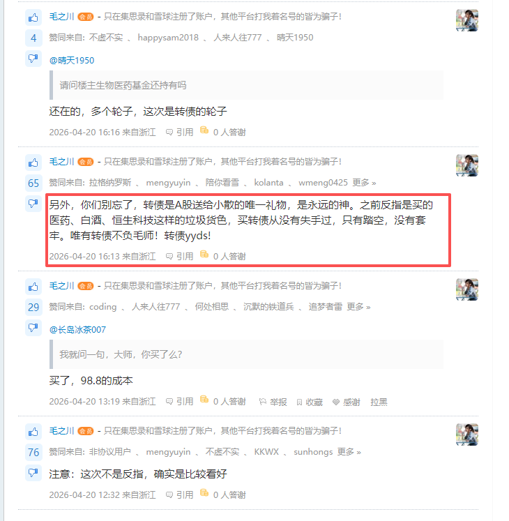 收益做的好一点后,后台也会有人私聊我交流,我现在的水平就是半桶水,所以也不发持仓了,省的最后亏钱挨骂。闻泰转债在金老师的池子里面,前几天老婆说金老师池子里面闻泰排名很靠前,我说金老师大概率不会持有它,现在确认了确实没有。金老师这2天在群里声明自己过滤掉了闻泰、三房等一类问题债,很多无脑抄作业的同学估计掉坑里面去了。所以我也就不写持仓操作了,省的我今天买了明天割了到时哪个老哥看了我的持仓亏钱了来骂我,能避免就避免。我的持仓风格后面可能相比以往要偏激进一点了,至于结果如何我也不清楚,所以这也是我不更新持仓操作的原因了,避免也坑了别人。