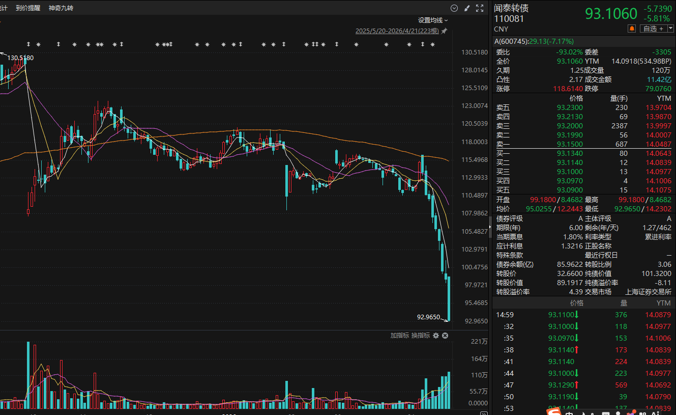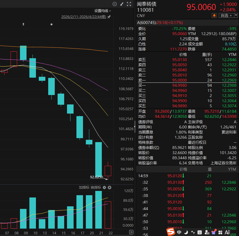 毛师看好闻泰转债,值得记录一下。对于闻泰的铁底在哪,我没有低价债,暴雷债博弈的经验,是有想法,但是当下低于100元的价格,感觉跟心中的价格差异还是太远。可能是90元 也可能是80元,谁知道呢?对找不到底的东西还是不安,不敢轻易下手,按理说到期108元就是底,但是这个底现在破了。