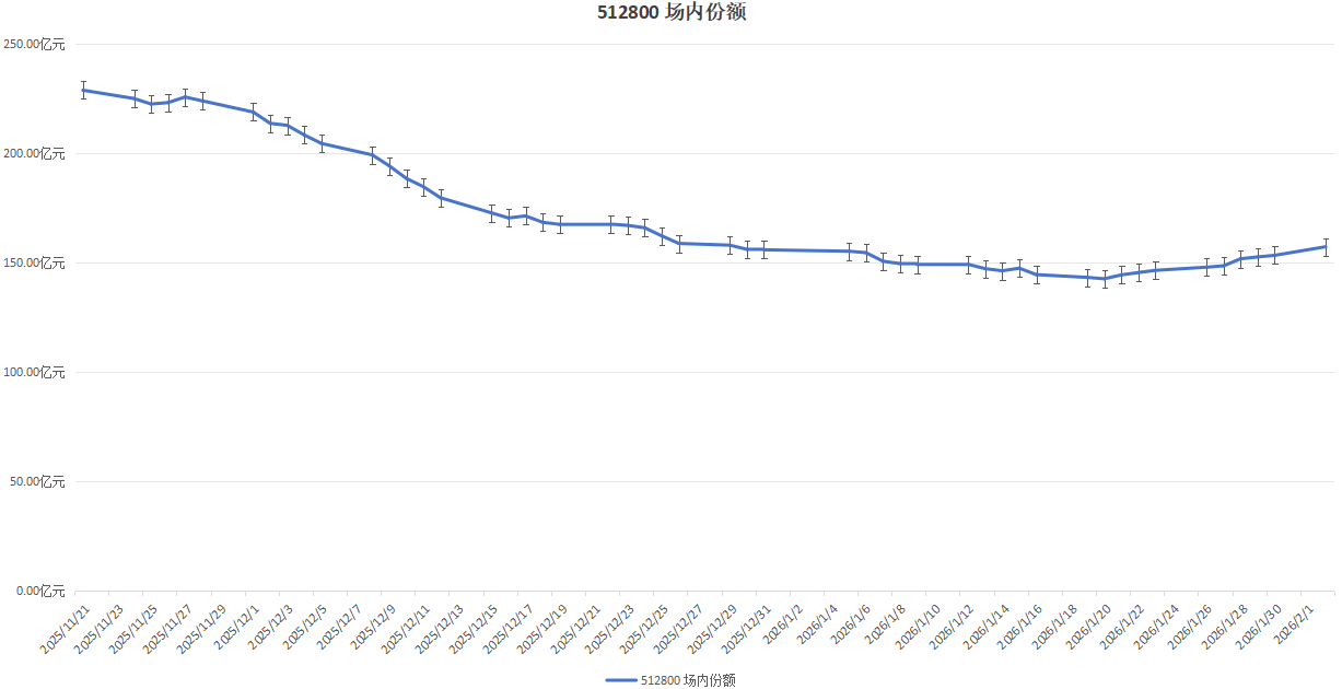 2、记录512800份额触底缓慢恢复;