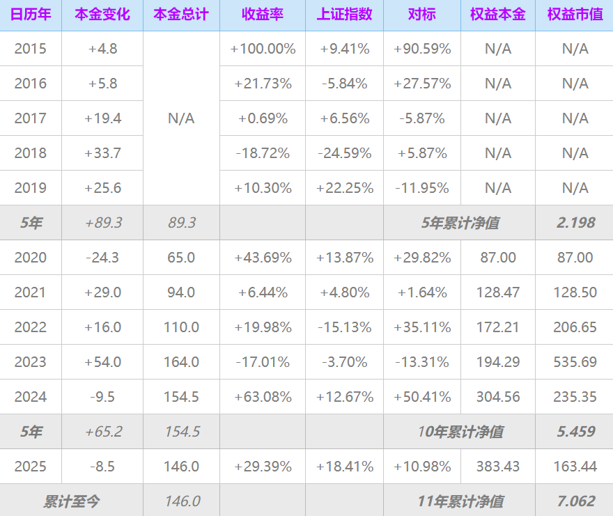 累计净值:截止2025年底,净值7.062,按年度复利收益计算。2015-2019券商+表格记录,2020年起通过有知有行记录。25年之后凑齐本金150万后不再持续投入本金。
