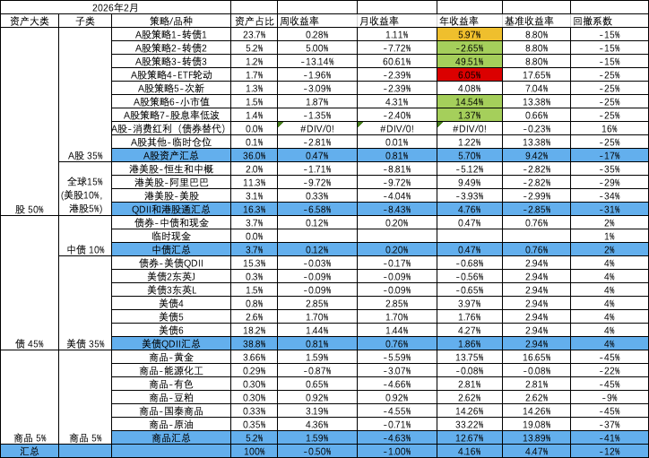 - A股策略内部:小市值,ETF轮动和次新均固定金额,盈亏均由转债再平衡