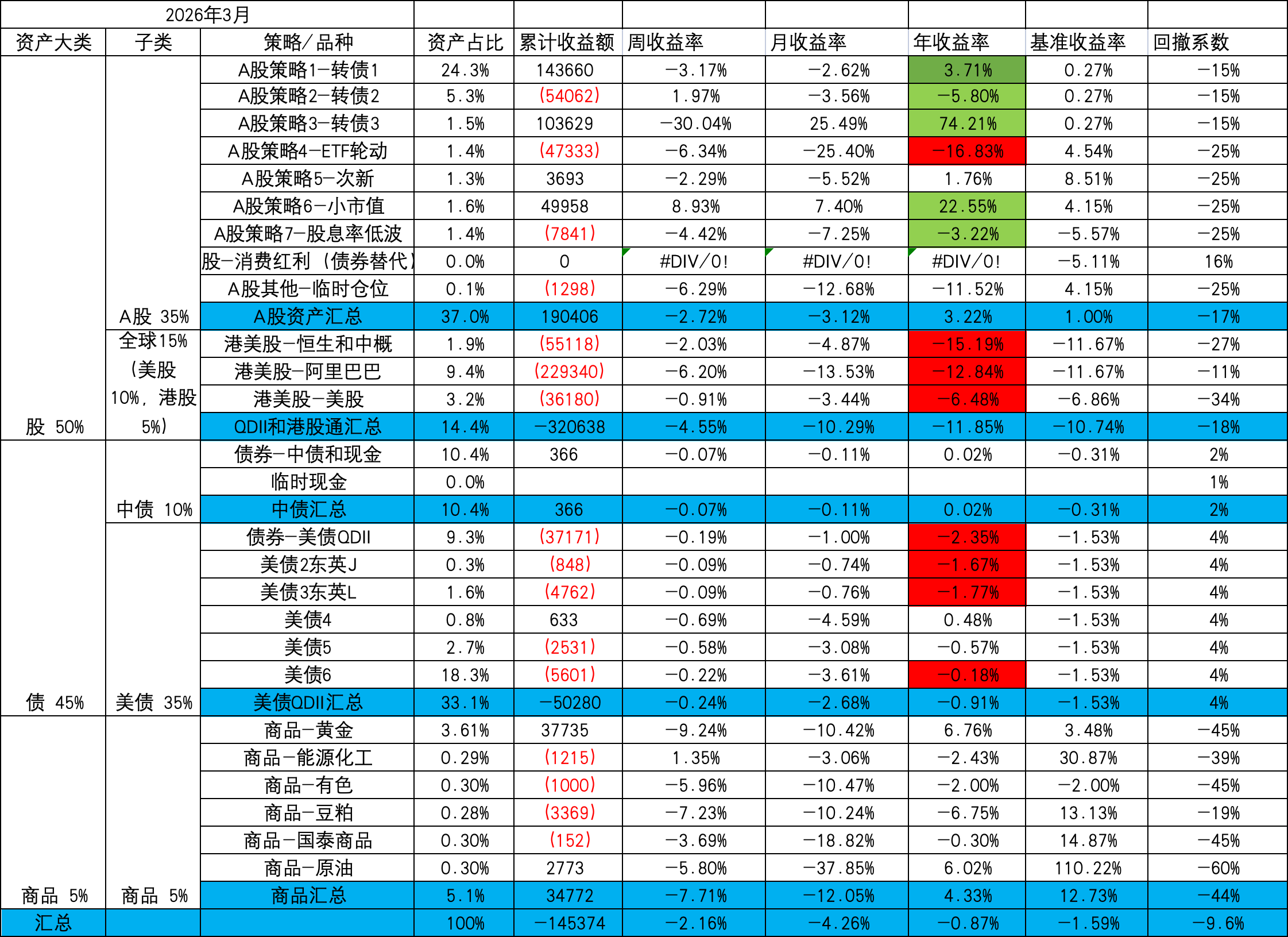 - A股策略内部:小市值,ETF轮动和次新均固定金额,盈亏均由转债再平衡