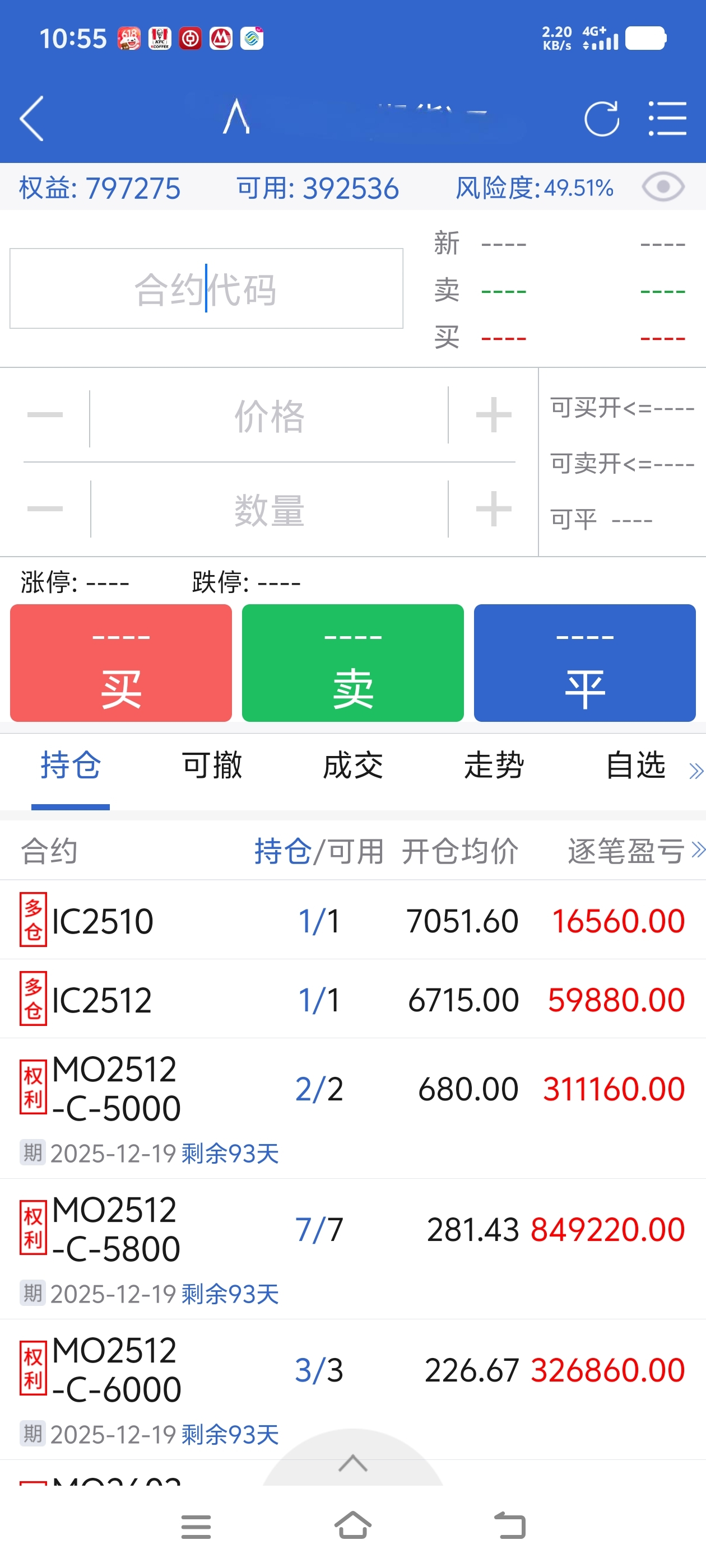 时间来到今年,错过了4月9日的抄底机会,当时手中只有1手IC期货,准备寻找一个合适的加仓点,后来参考北京保安的期货期权,买入4手深市值期货期权,当时的考虑是如果期权部分全部归零,资金量由140w降低到110w左右,如果指数不涨不跌,也有一点贴水可以吃,后续,随着指数的上涨,买入十手平值(浅虚值)期权(这一部分已做好持有归零准备),后来中证500以及中证1000指数一路上涨,达到预设条件,卖出相应的期货期权。