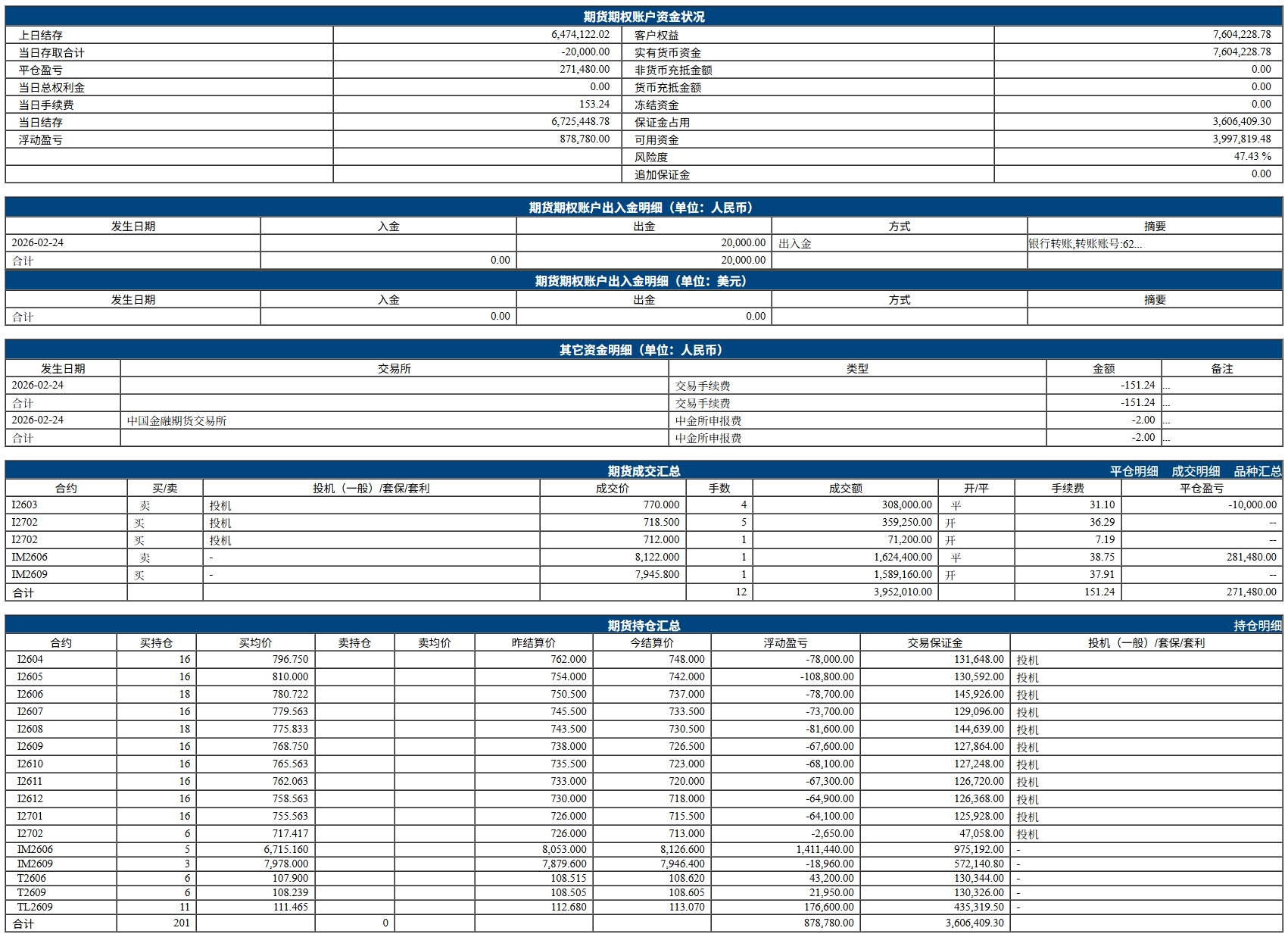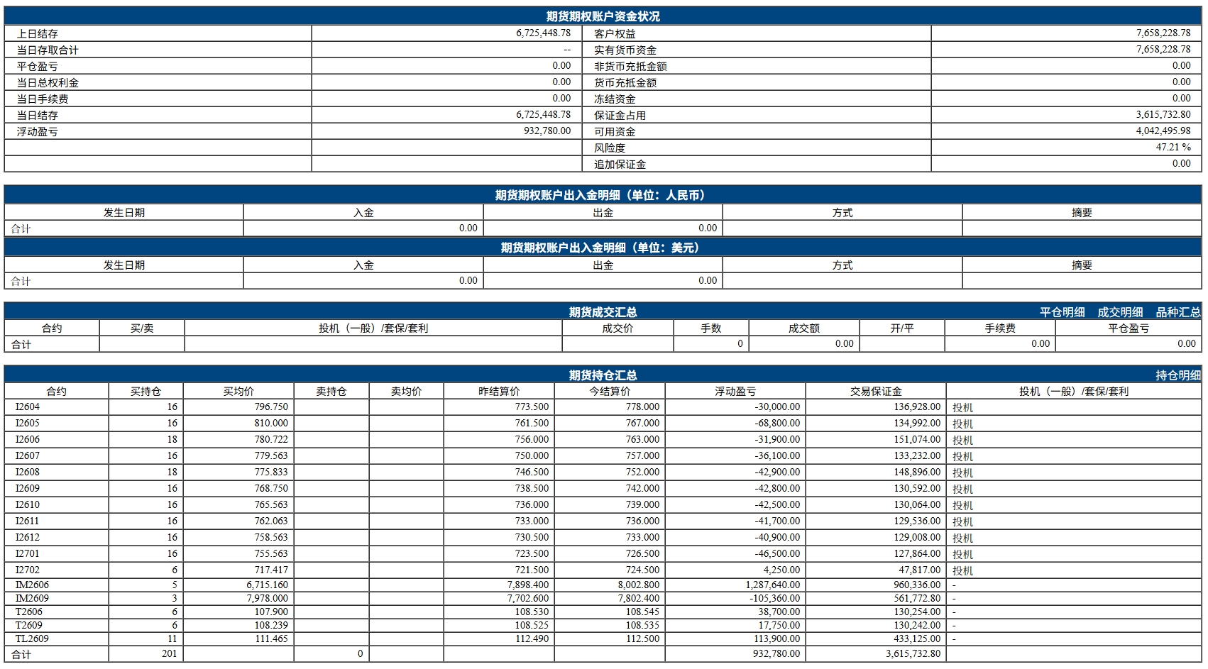 缺乏止盈止损纪律:IM 盈利丰厚未锁定,铁矿石浮亏未止损,完全依赖 “贴水收敛” 的信仰,忽视极端行情风险。