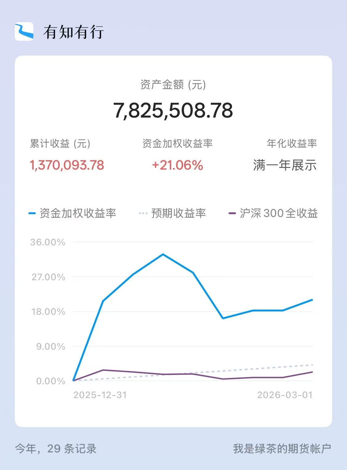 我现在的收益算方式就是把每天结算后的账户权益输入有知有行APP,再由APP按资金加权收益法计算。该方法省事。但就是不知道收益里面,贴水贡献多少、指数上涨贡献多少。