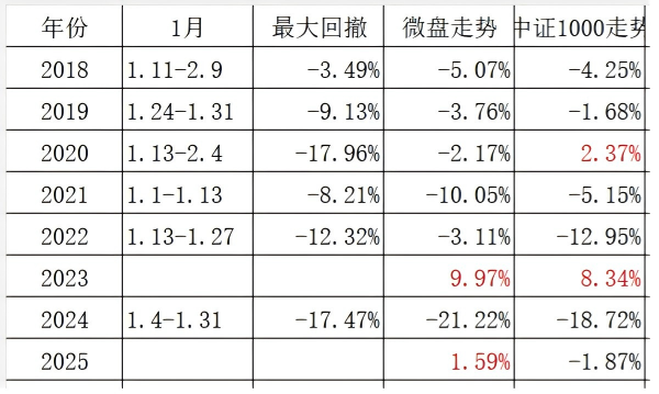 看着指数上涨,自己空仓,冲进去又怕两头挨打,好难受啊。过去8年,中证1000指数6年下跌,2年上涨,最近4年日历效应似乎有减弱迹象。21年和24年都是接着上一年继续下跌;19年是中下旬急跌;其他三个年份都是月中开始回撤。照瓢画葫芦,功夫还未到家,继续空仓,等到下周中看看