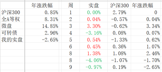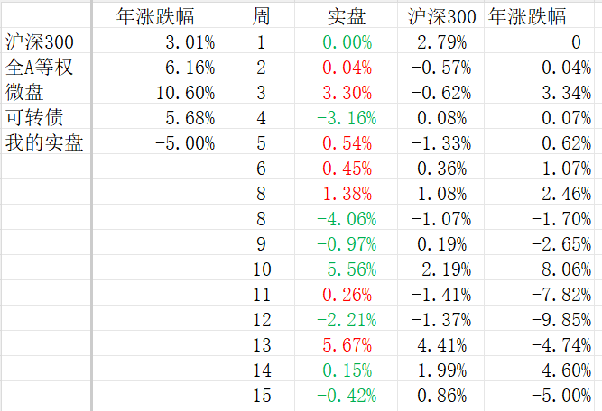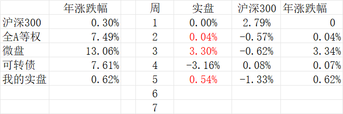 我的1/4资金是小微盘股策略,本周微盘股表现良好(上涨2.43%);1/8资金配置了科技行业,本周科创走弱,科创50下跌5.76%。其他策略总体还行,所以综合表现略微好于基准沪深300。