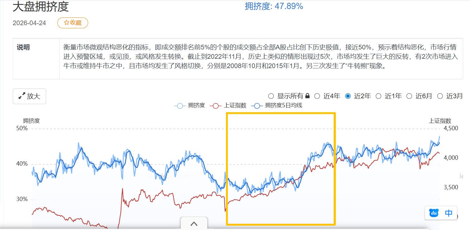 广发证券有篇文章,交易额前5%的个股在全市场交易额中的占比在50%附近时,市场会极度拥挤,往往在高点冲顶时会发生这个现象。乐咕乐股有的市场景气度(逃顶利器)在记录这个指标。目前的行情与去年的4月至8月相反,那时指数不断走高,但热点分散,各个板块都有机会,大家都能赚钱。而现在却是相反。