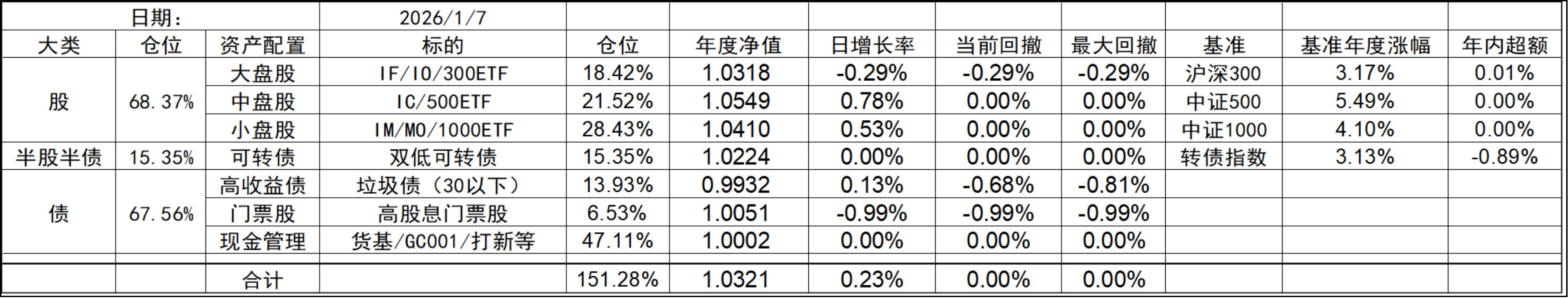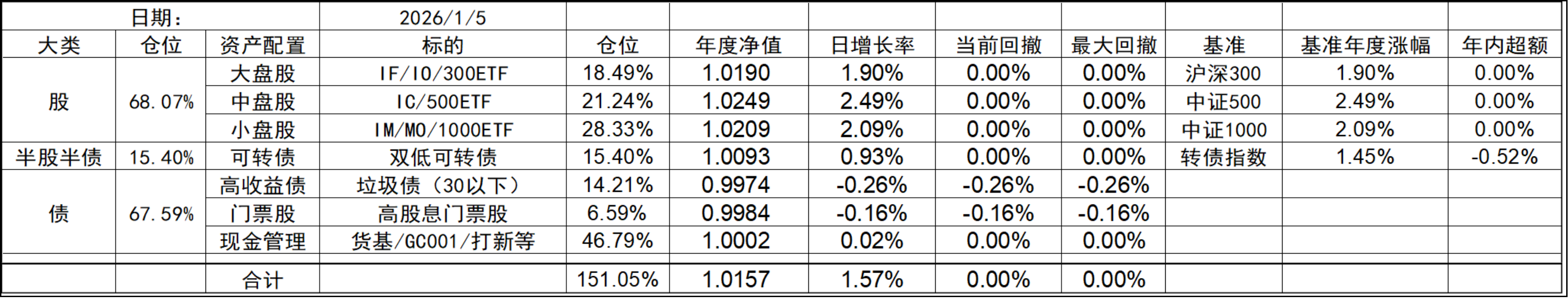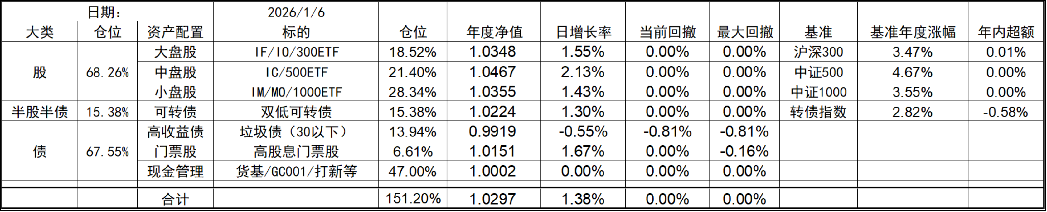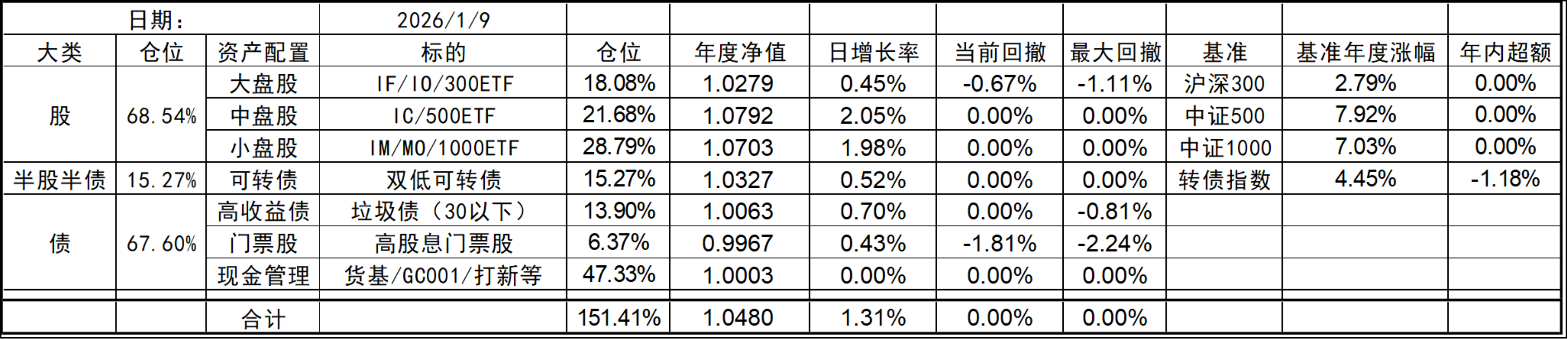 今年的持仓和去年底没有什么变化,微微加仓了点垃圾债,其实就是万科债,由于年底也未主动做平衡。这样持仓继续是7个葫芦娃了。未来一年大概率整体依然是坚持不择时、不深研选股的买入、持有、平衡、套利的策略,投研精力继续放在债端的各种低风险策略上。权益类等效仓位最高不超过100%,固收类则不超过80%,杠杆率控制在130%~180%之间。