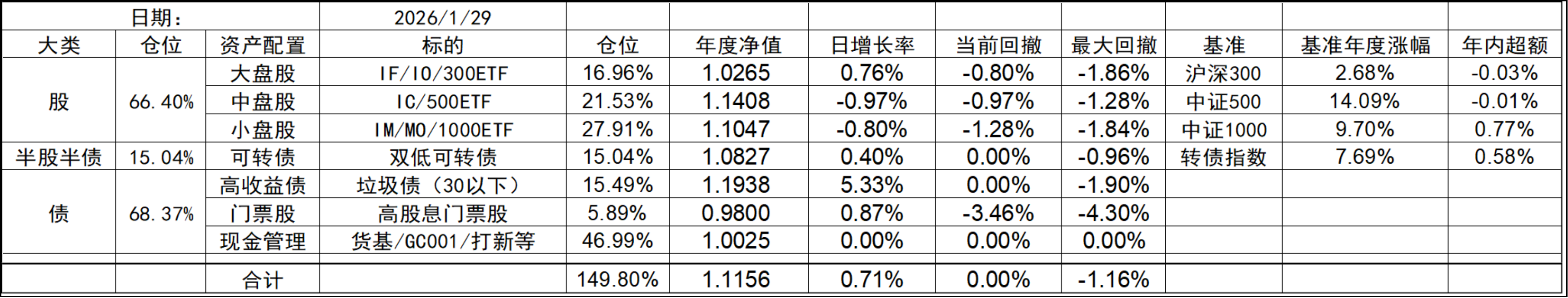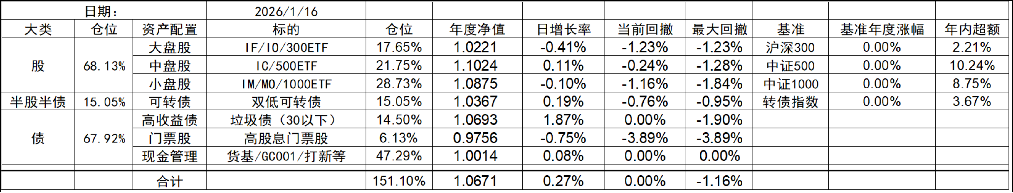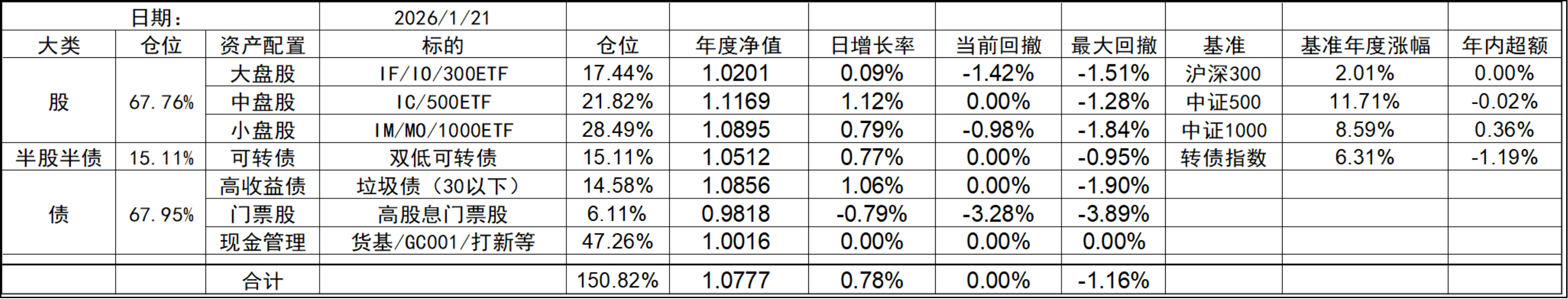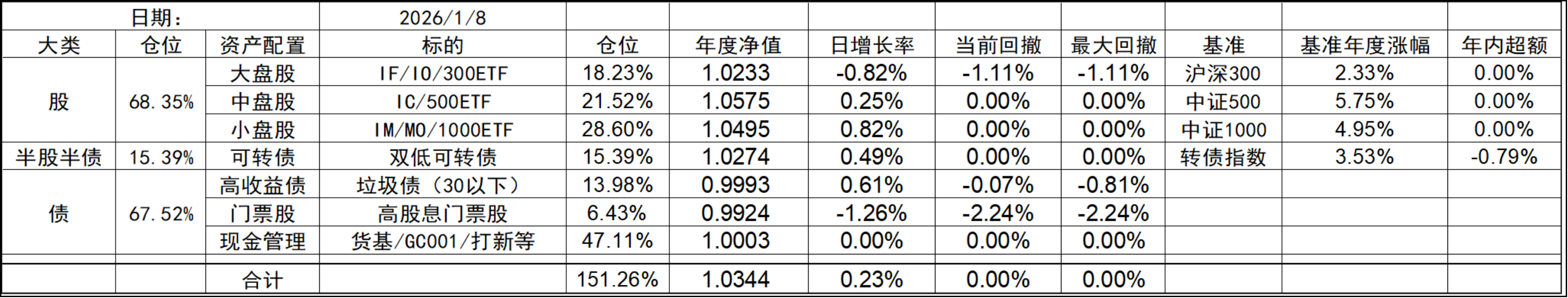 今年的持仓和去年底没有什么变化,微微加仓了点垃圾债,其实就是万科债,由于年底也未主动做平衡。这样持仓继续是7个葫芦娃了。未来一年大概率整体依然是坚持不择时、不深研选股的买入、持有、平衡、套利的策略,投研精力继续放在债端的各种低风险策略上。权益类等效仓位最高不超过100%,固收类则不超过80%,杠杆率控制在130%~180%之间。