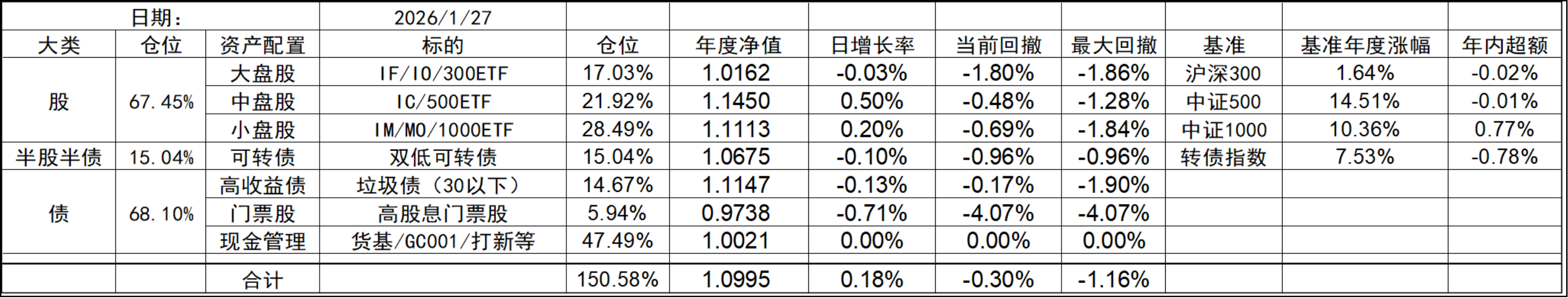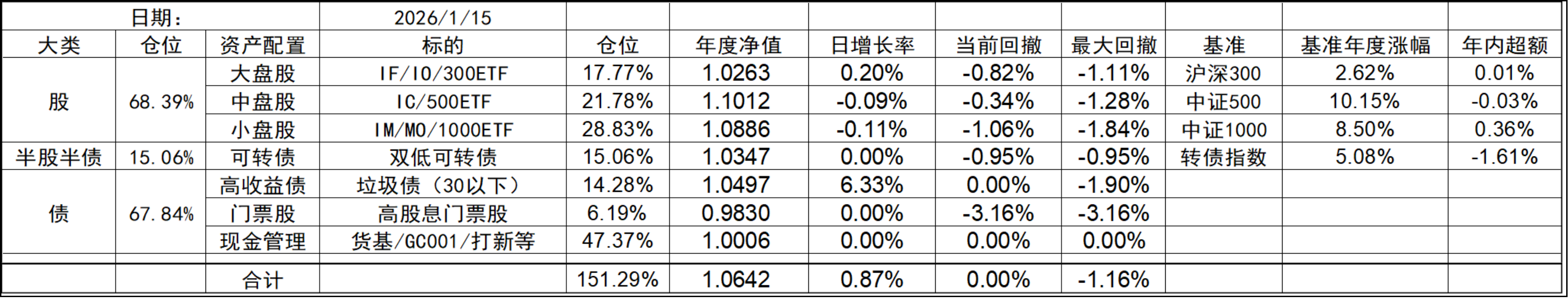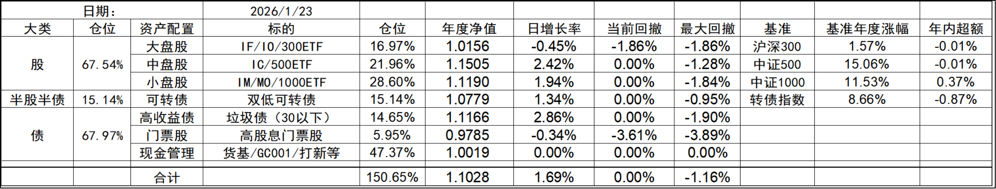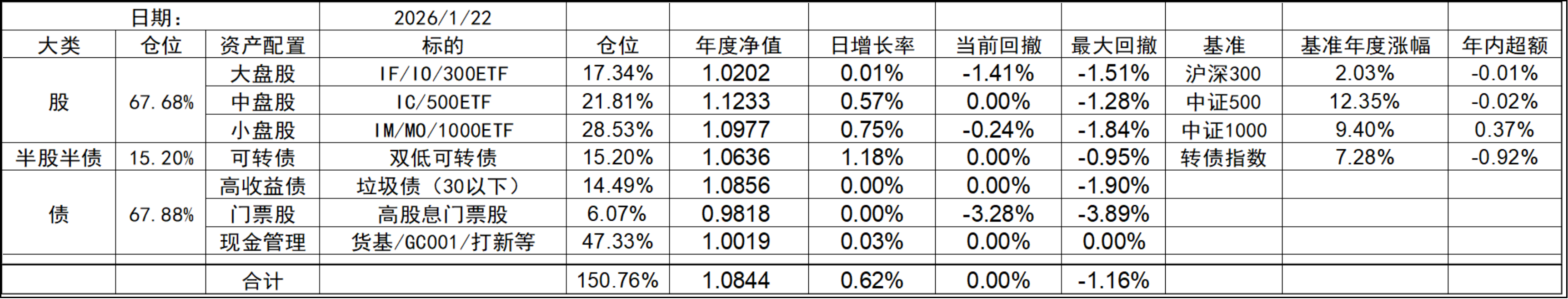 今年的持仓和去年底没有什么变化,微微加仓了点垃圾债,其实就是万科债,由于年底也未主动做平衡。这样持仓继续是7个葫芦娃了。未来一年大概率整体依然是坚持不择时、不深研选股的买入、持有、平衡、套利的策略,投研精力继续放在债端的各种低风险策略上。权益类等效仓位最高不超过100%,固收类则不超过80%,杠杆率控制在130%~180%之间。