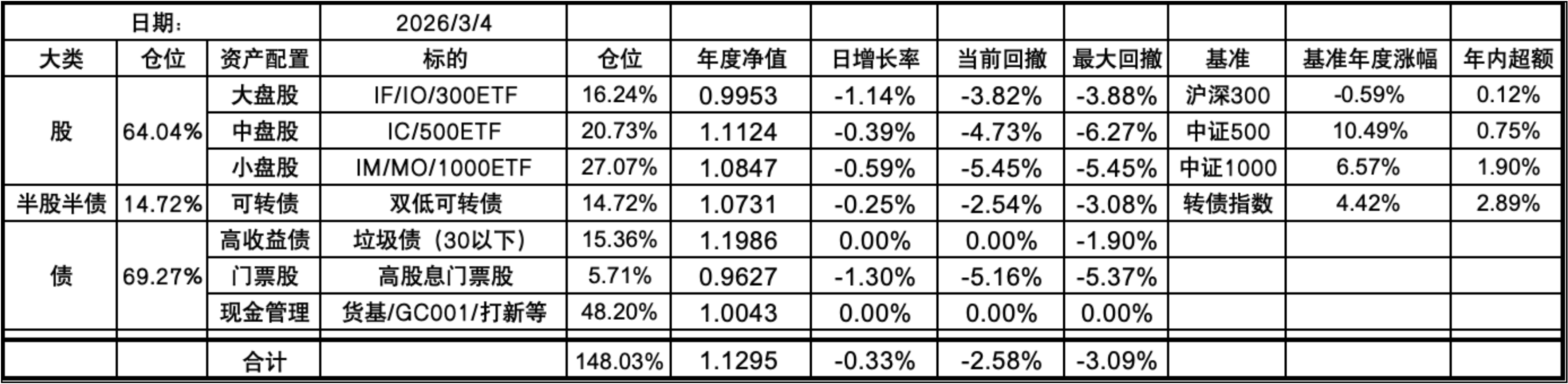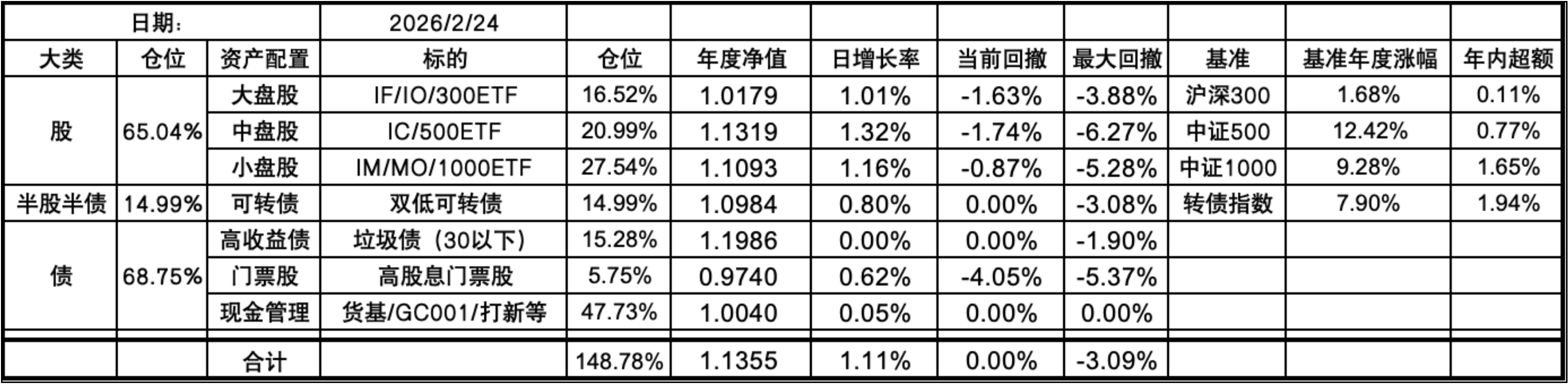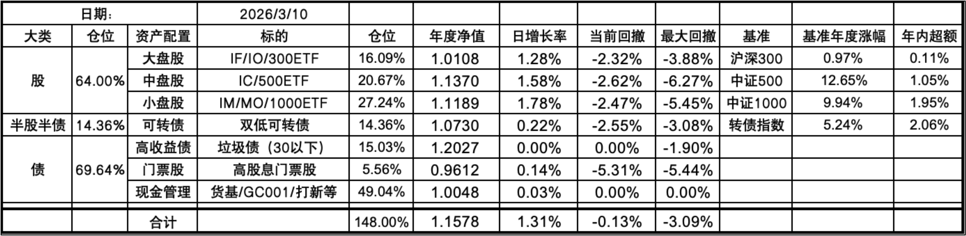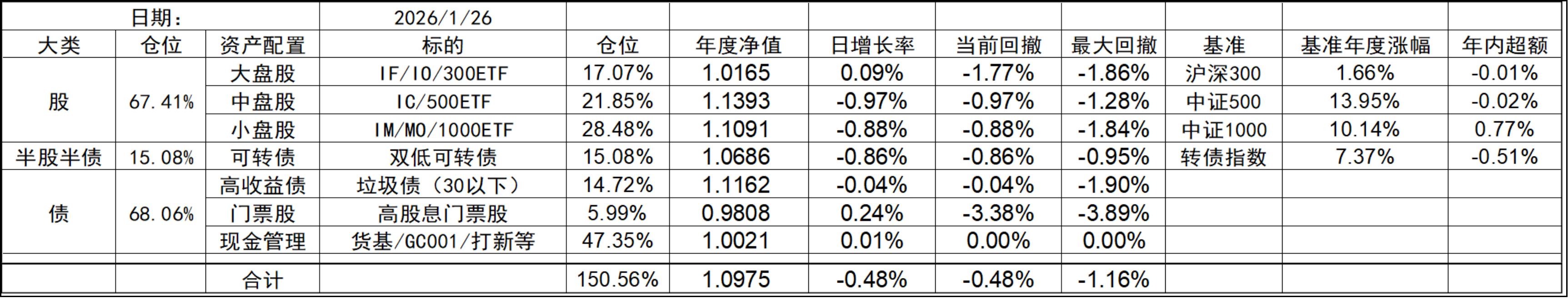 今年的持仓和去年底没有什么变化,微微加仓了点垃圾债,其实就是万科债,由于年底也未主动做平衡。这样持仓继续是7个葫芦娃了。未来一年大概率整体依然是坚持不择时、不深研选股的买入、持有、平衡、套利的策略,投研精力继续放在债端的各种低风险策略上。权益类等效仓位最高不超过100%,固收类则不超过80%,杠杆率控制在130%~180%之间。