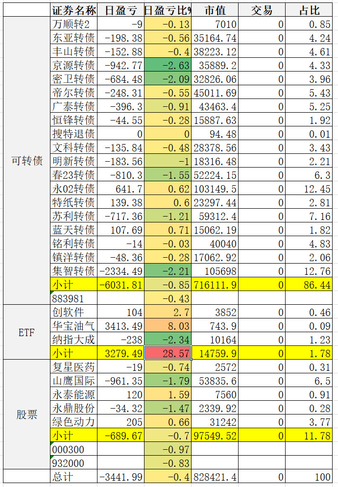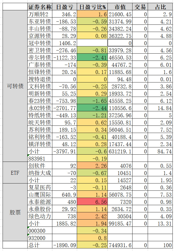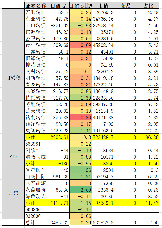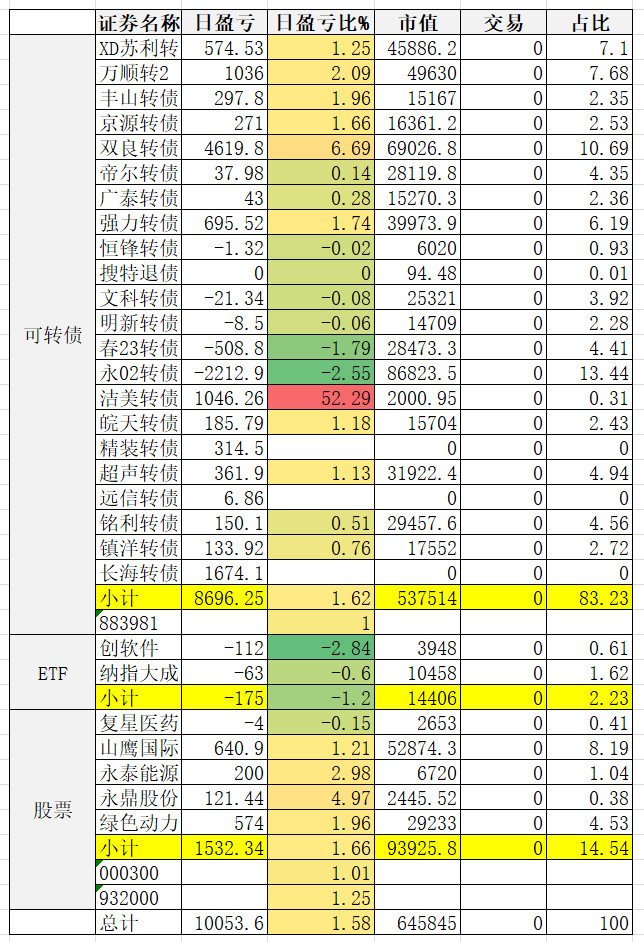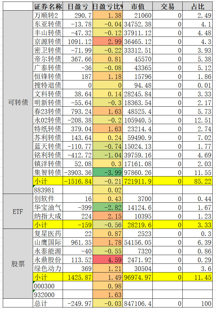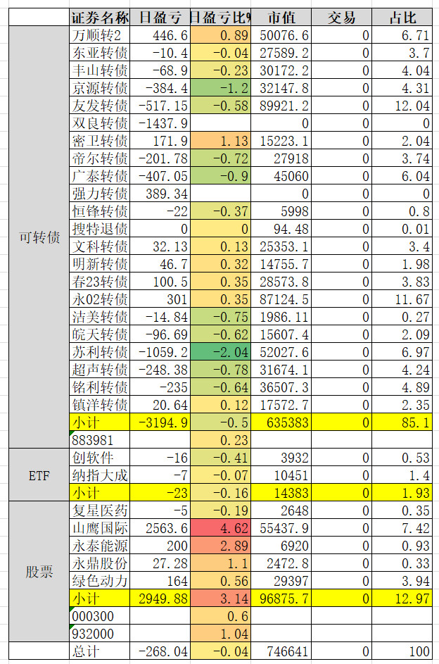 1、实盘收益 0.34%。亏损较大的永02、春23、帝尔。永02还在杀溢价。