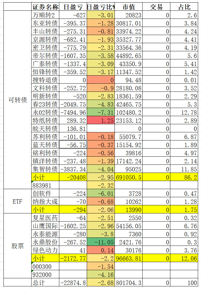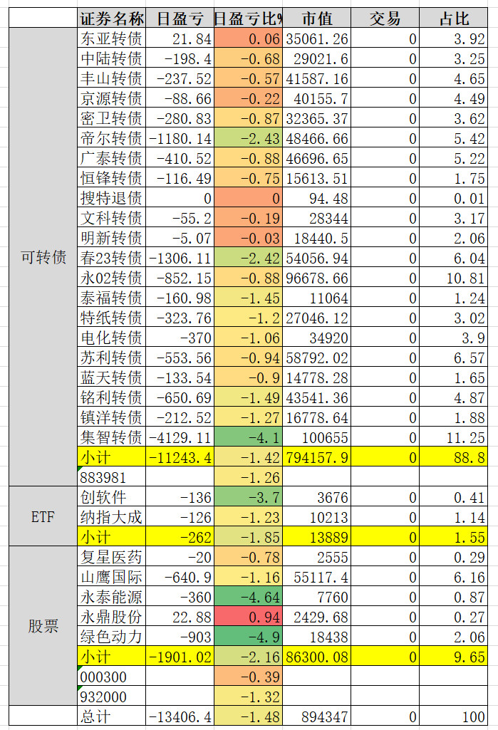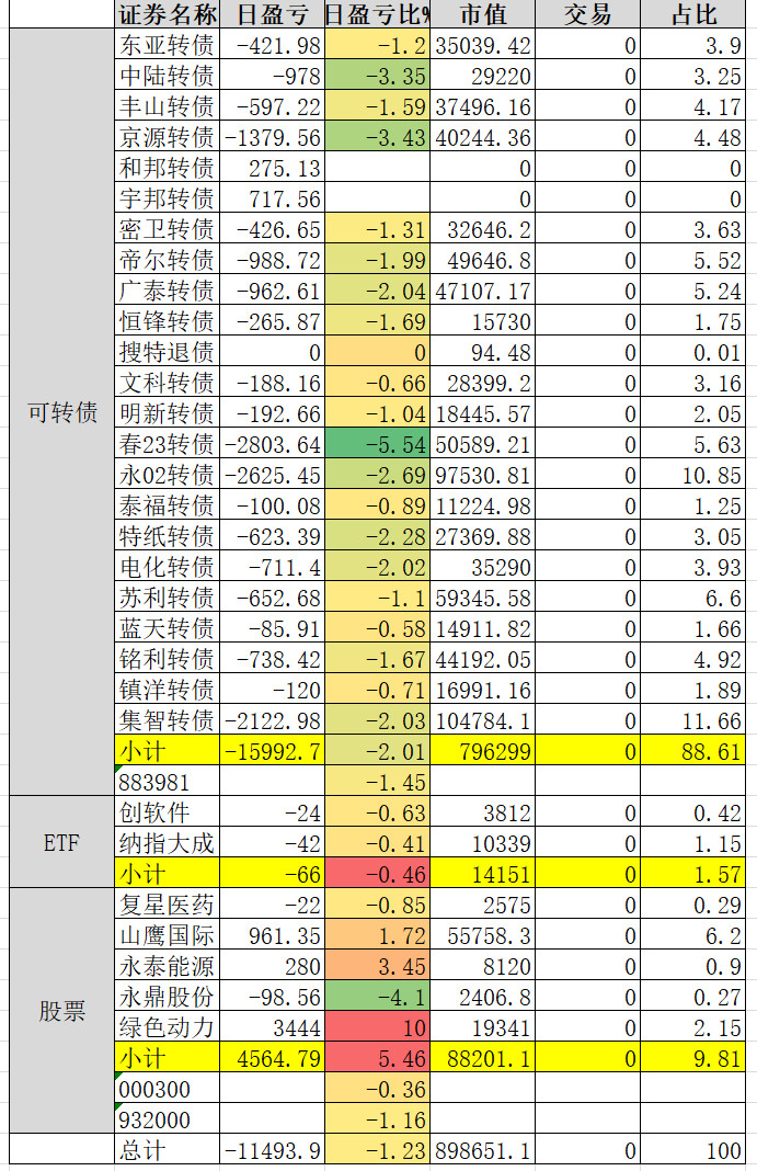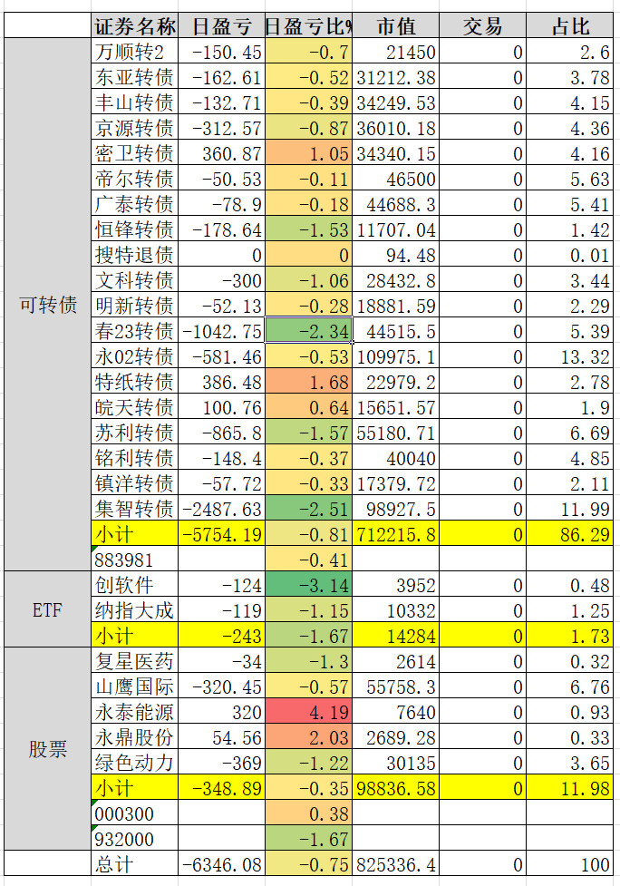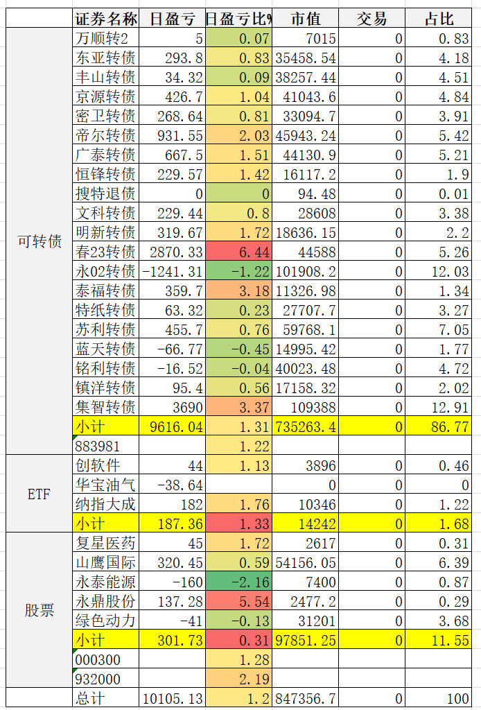 1、实盘收益 0.34%。亏损较大的永02、春23、帝尔。永02还在杀溢价。