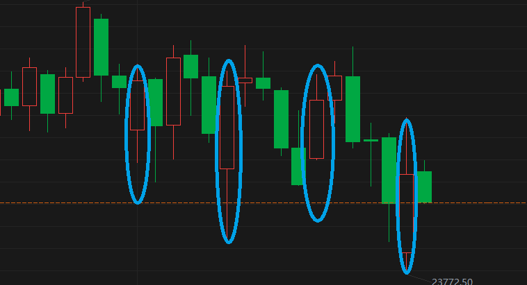 这个是22年大跌的五浪,每一个下跌浪,就是一三五浪里,都有很明显的小五浪。四小时布林带的下轨就很明显的能看出来,底部是否出现。