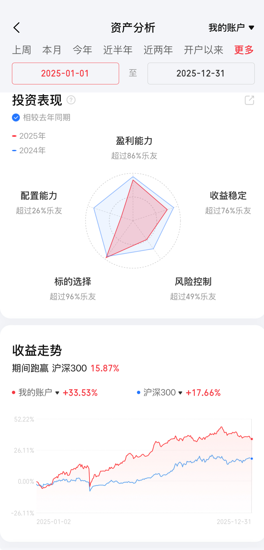 2025年收益主要来源于金斯瑞生物科技、联邦制药、腾讯控股、阿里巴巴-W、中远海控以及中国有色矿业、云铝股份、中国铝业和各种红利股,亏损主要来源于中海物业、保利物业以及几个创新医药股,遗憾在上半年有色股没有重仓,全年收益33.5%。2026年计划: 1、五个原则: 分散、低估、股息、成长、网格,单行业和个股低于25%,估值高且成长不确定不买,看不懂的不买,股息保底。 2、五个领域: 物业:中海物业、保利物业;科技:腾讯控股、阿里巴巴-W、中国民航信息网络;航运:中远海控、东方海外国际;红利:联邦制药、中国移动、第一太平、中国海洋石油、华能国际、国投电力、川投电力、国电电力、理文造纸、东岳集团、特步国际、中化化肥等等;网格:以上各股以及港股创新药ETF、恒生科技ETF、红利低波ETF、巴西ETF、沙特ETF、亚太精选ETF、华宝油气LOF等。 3、现市场总体估值偏高,但利率维持低水平,2026年给个上证3500-4500的预测吧,投资为A股和港股结合,以港股为主,期望全年收益-10%到15%。