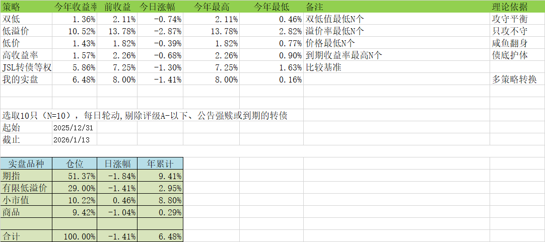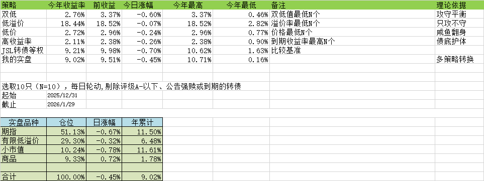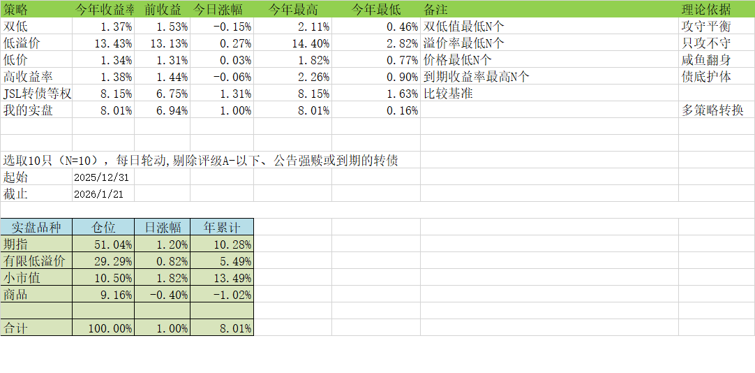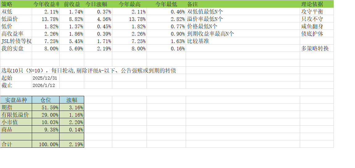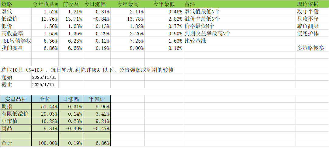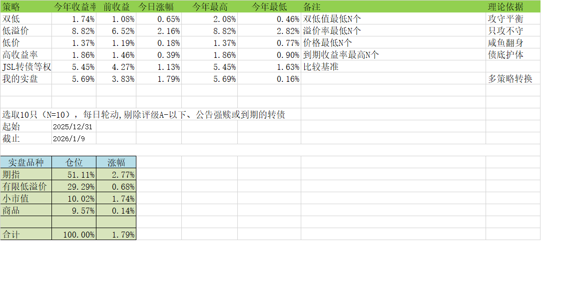 筛选逻辑:选 “价格低 + 转股溢价率低” 的前 10 只转债(双低值最低 N 个)。