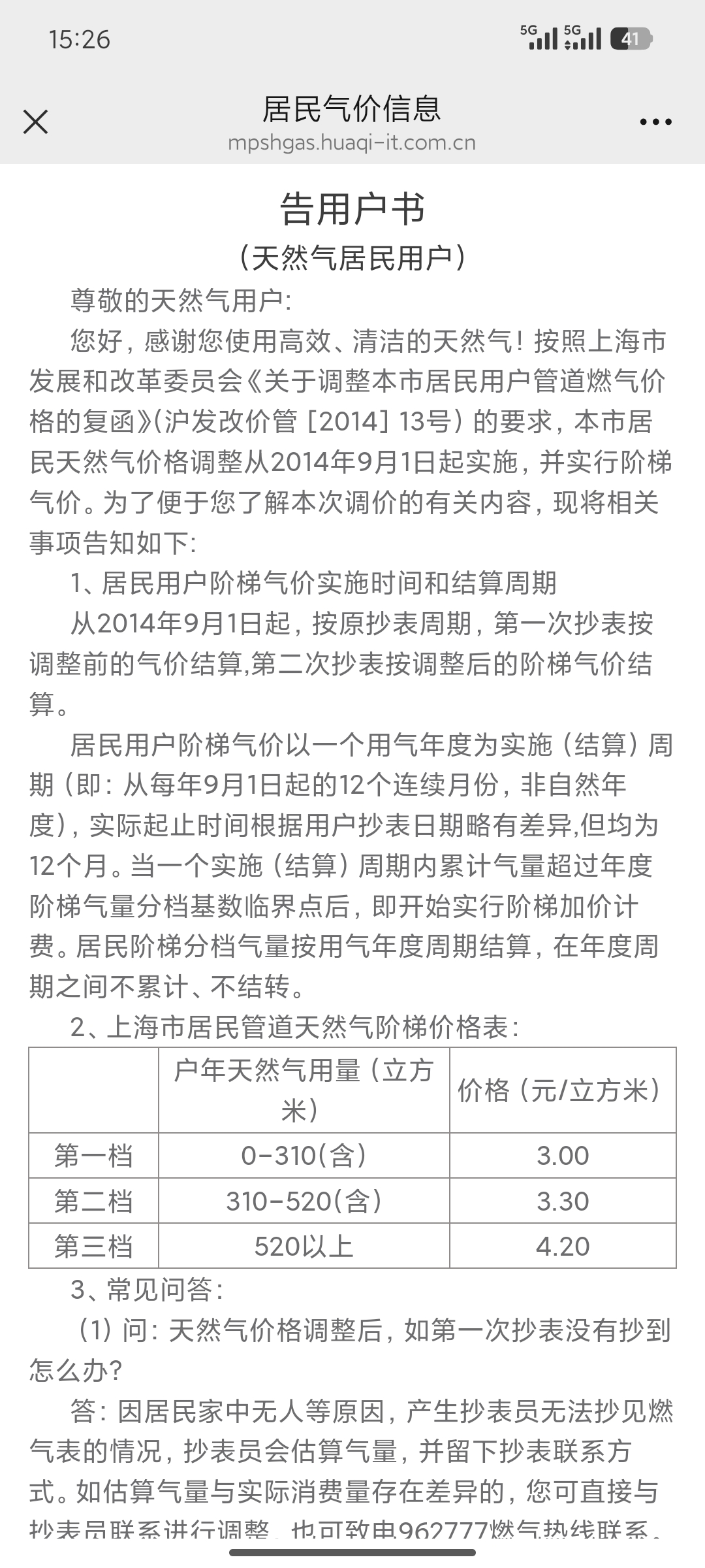 那里燃气价格3.15元/m³