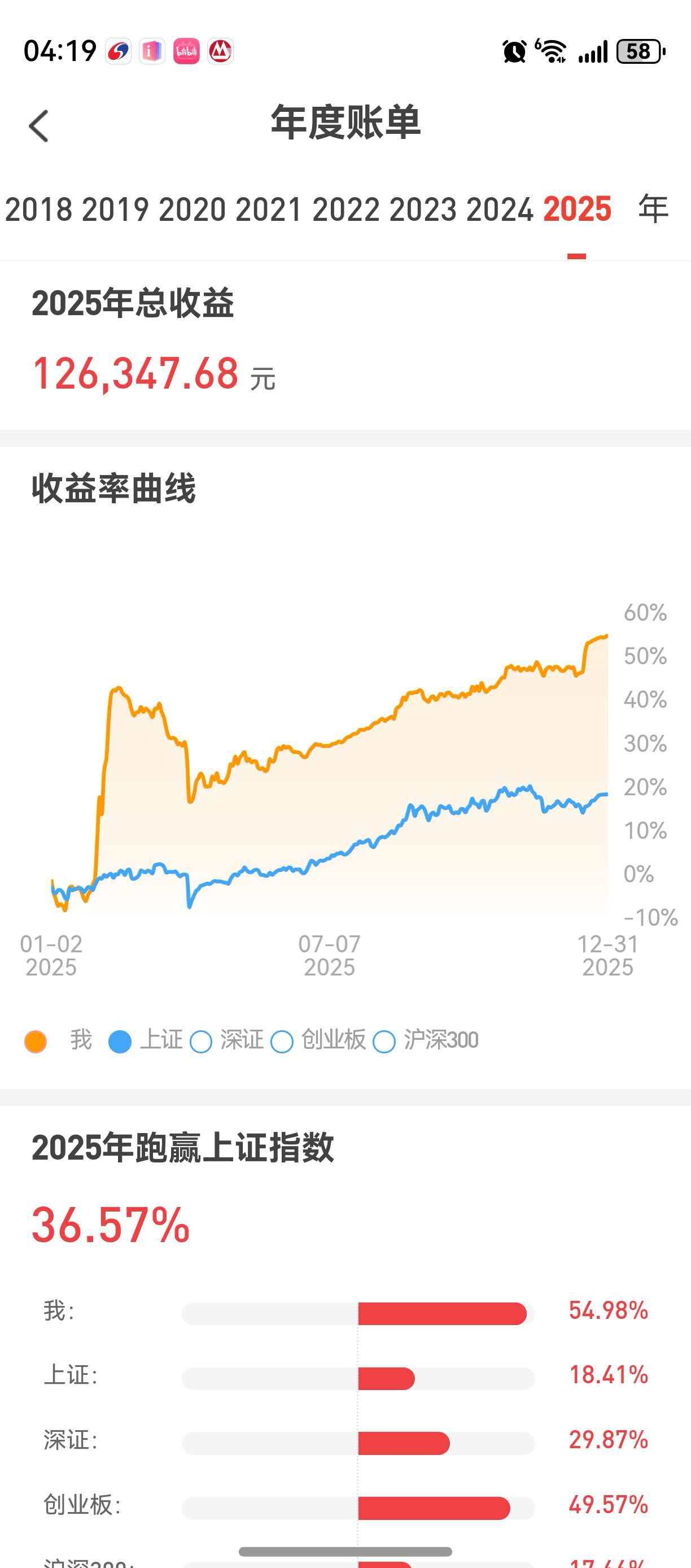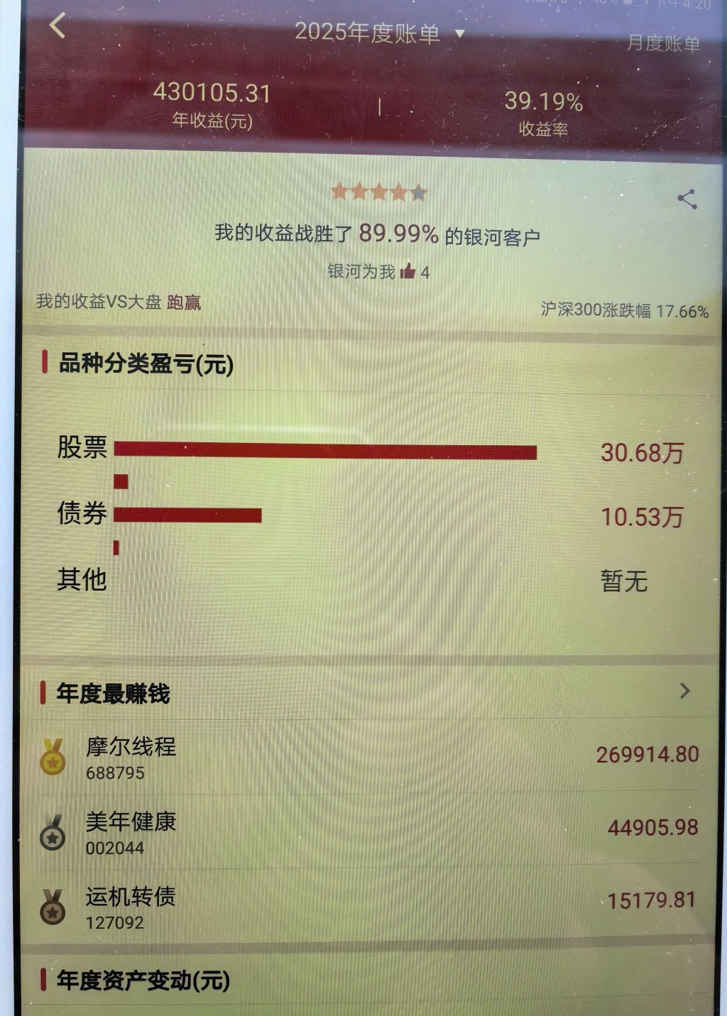 2025年的投资虽跌宕起伏,但还是有意外和惊喜。今年亏损主动割肉的操作减少了,止损条件单触发了好几笔,年初3个月不菲的收益遭遇关税战很快接近清零,顶住加仓扛了过来,总收益额是历年来最大的。不过除去新股的收益,本年真实的交易收益应在23%左右,在2025年的大牛市里拖了大家后腿了。